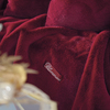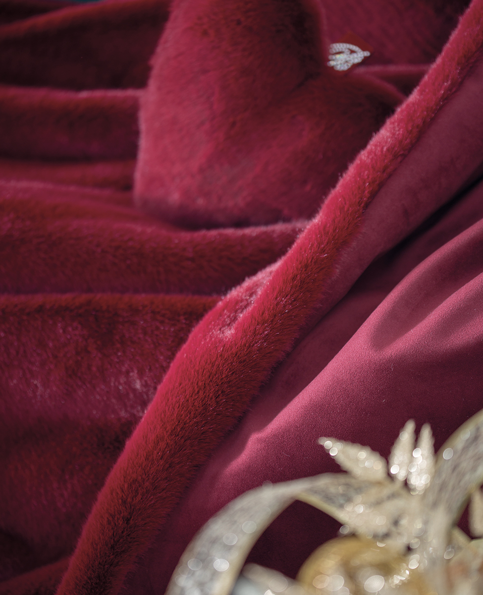 Plaid in ecopelliccia con logo Blumarine in cristalli su nastro gros grain, retro in velluto tinta unita.