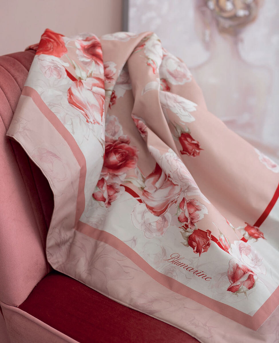 Caldo pareo con stampa piazzata, garzato e con logo Blumarine in stampato, tessuto del retro garzato e stampato con logo Blumarine all-over.
