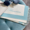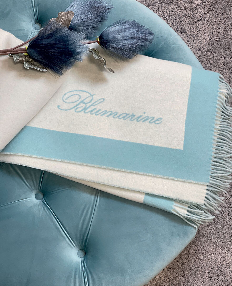 Plaid in pura lana vergine con trama jacquard piazzata e logo Blumarine lungo 28 cm, bordi alti 8 cm sui quattro lati, frange sui lati corti alte 9 cm.