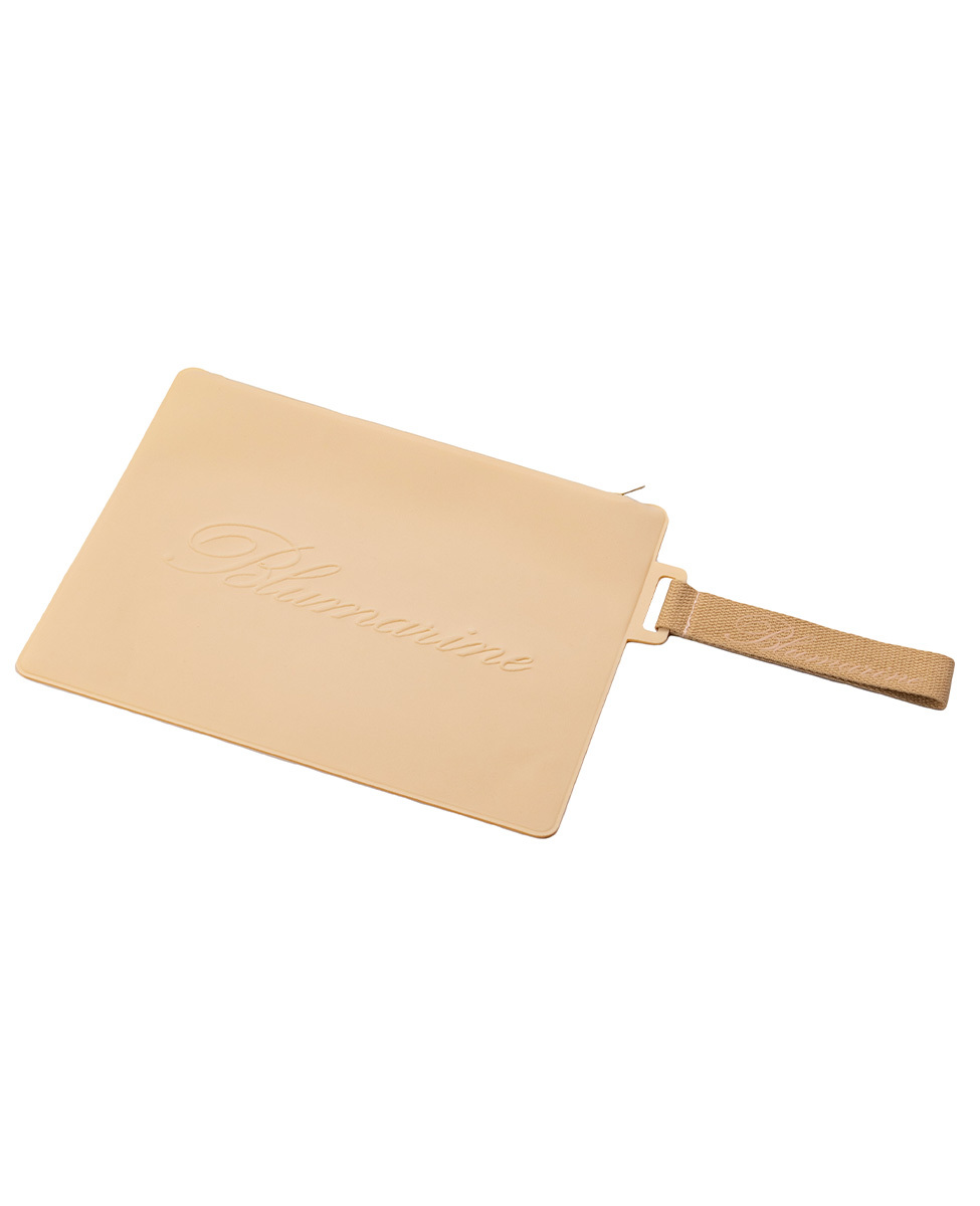 Pochette da mare in Lycra, elegante e versatile, con logo Blumarine stampato a caldo per un tocco distintivo. Dotata di un bracciale da polso in corda, alto 3 cm, che unisce funzionalità e stile.