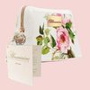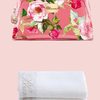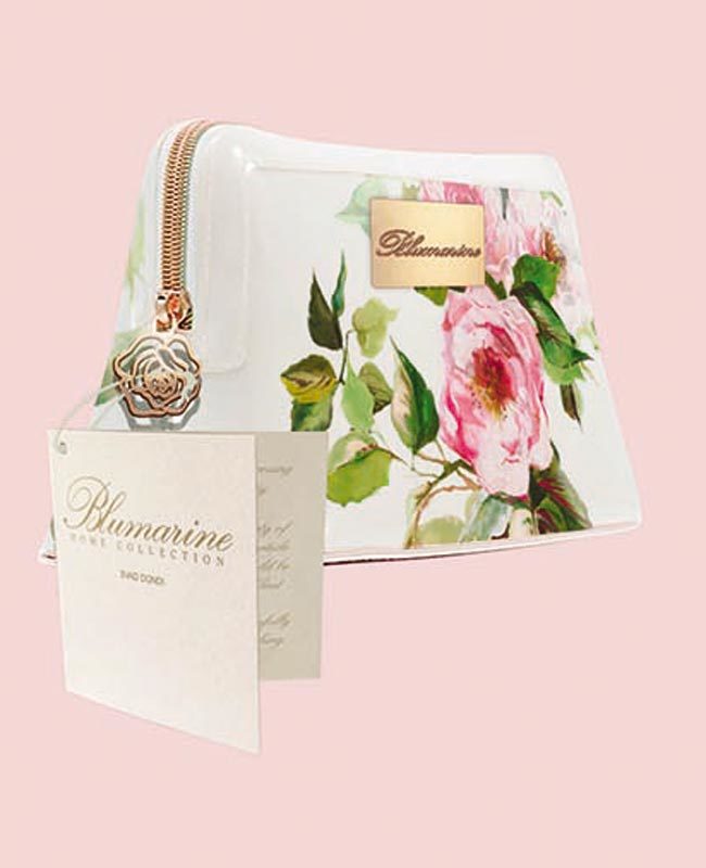 Pochette in PVC lucido stampato e fodera interna logata Blumarine. Chiusura con cerniera. Contiene 2 lavette bianche di cm 25x25.