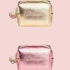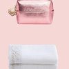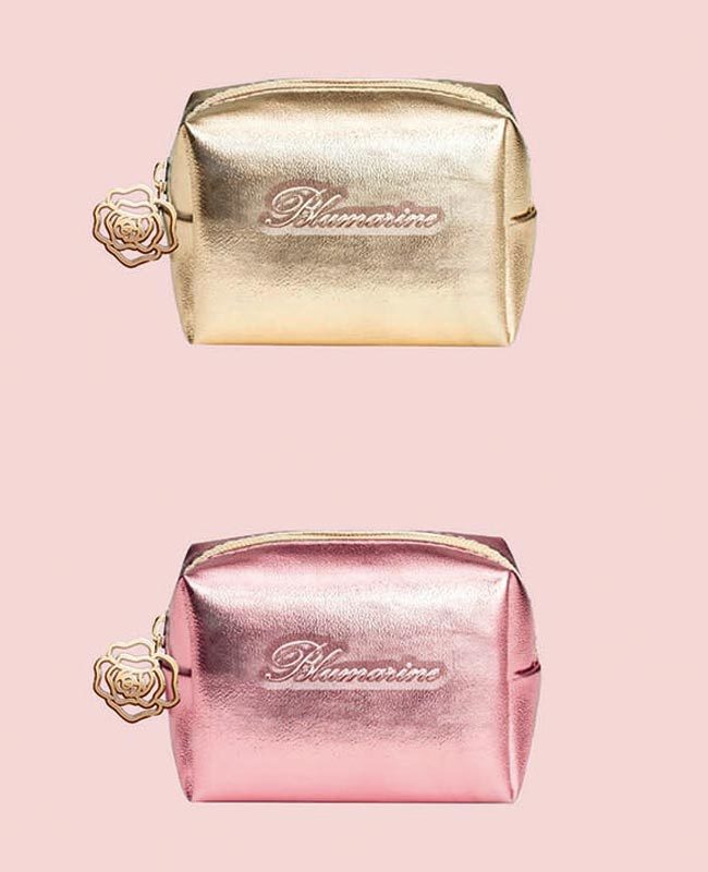 Pochette metallizzata con fodera interna logata Blumarine e chiusura con cerniera. Contiene 2 lavette bianche di cm 25x25.
