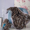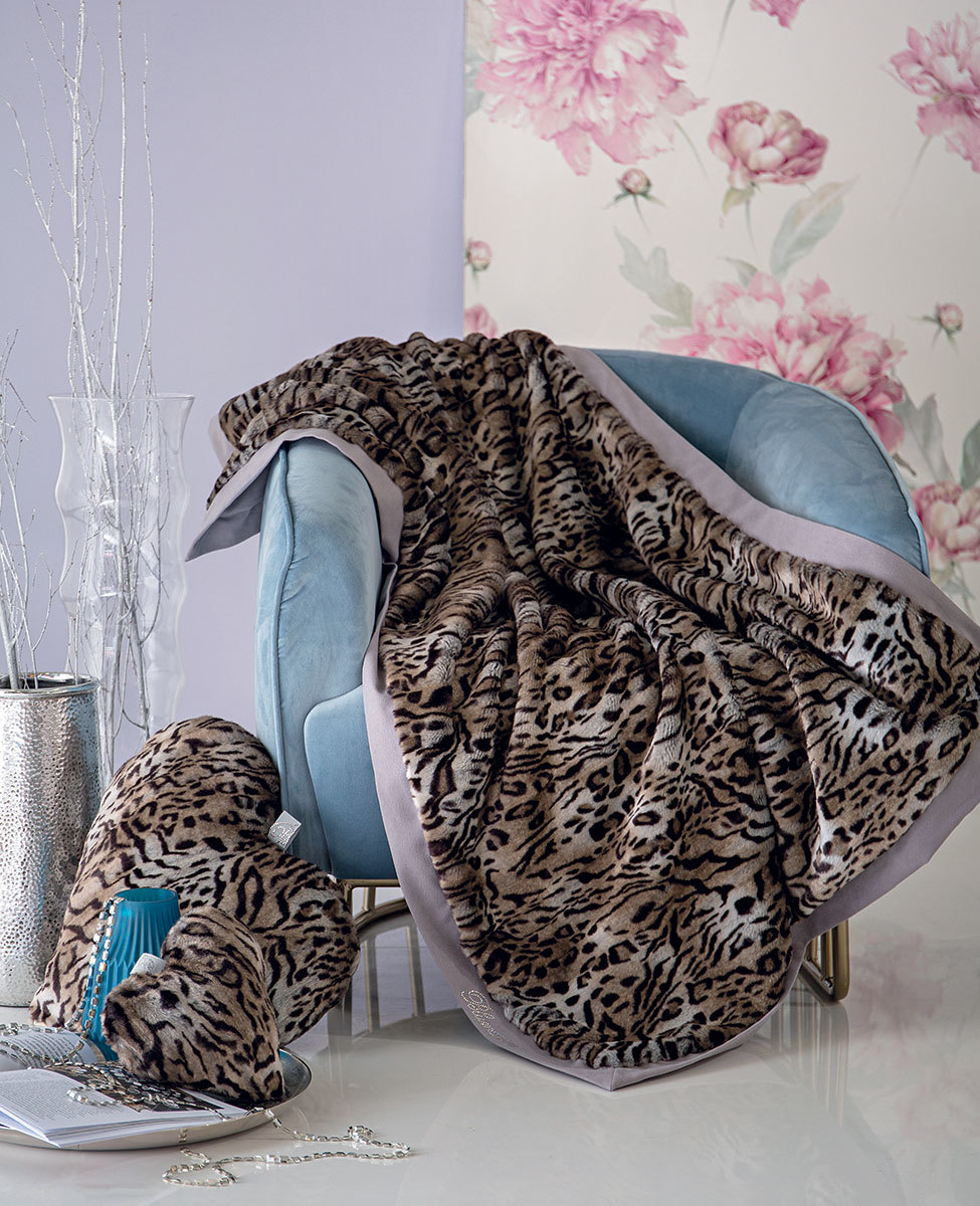 Copriletto matrimoniale in morbidissima pelliccia sintetica con motivo animalier, rifinito con un doppio bordo tinta unita, rimesso in allungatura, in un tessuto mano pesca, logo Blumarine in cristalli applicato sul bordo.