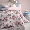 Copriletto matrimoniale in raso con stampa floreale e bordi applicati in morbida pelliccia sintetica su 3 lati.