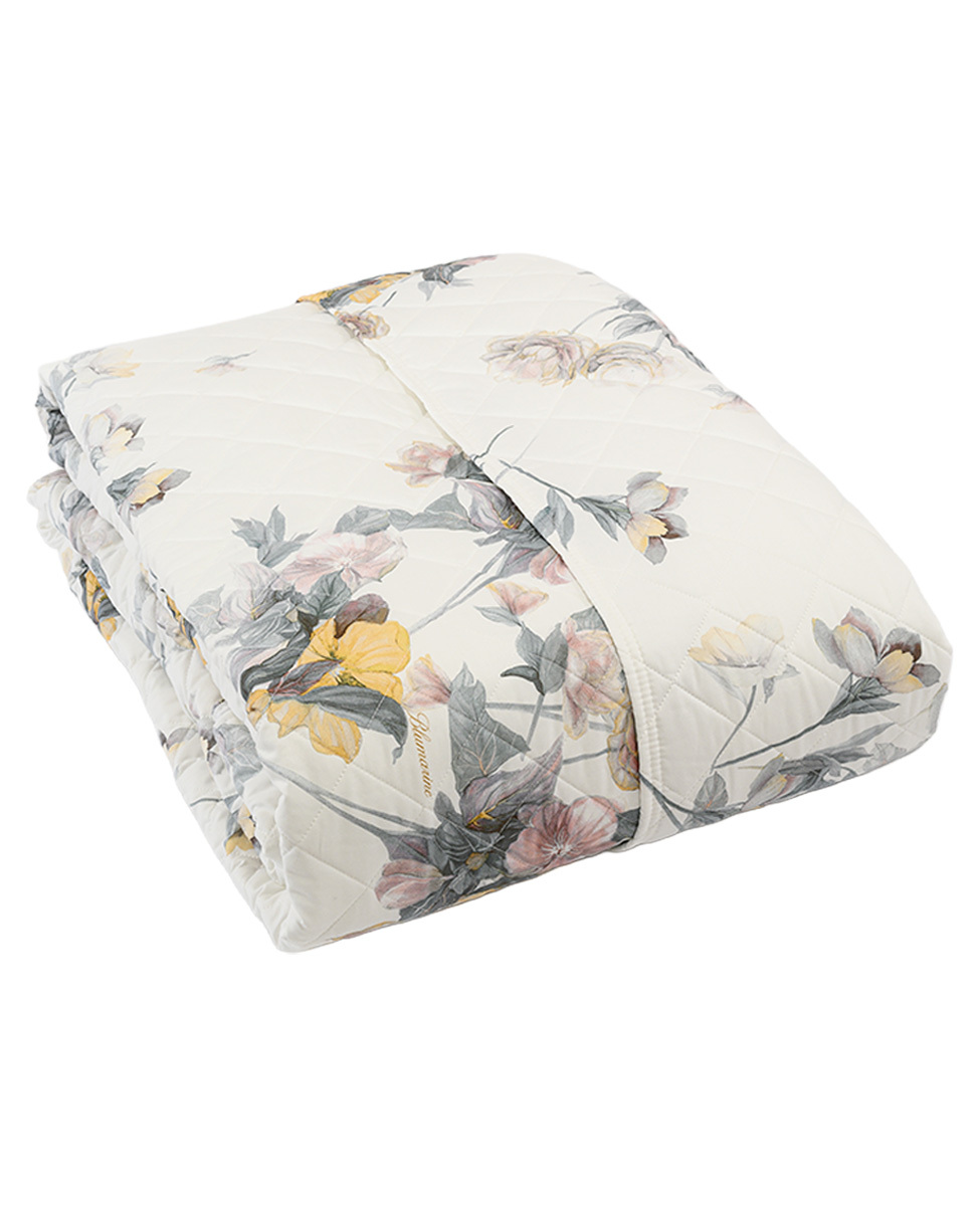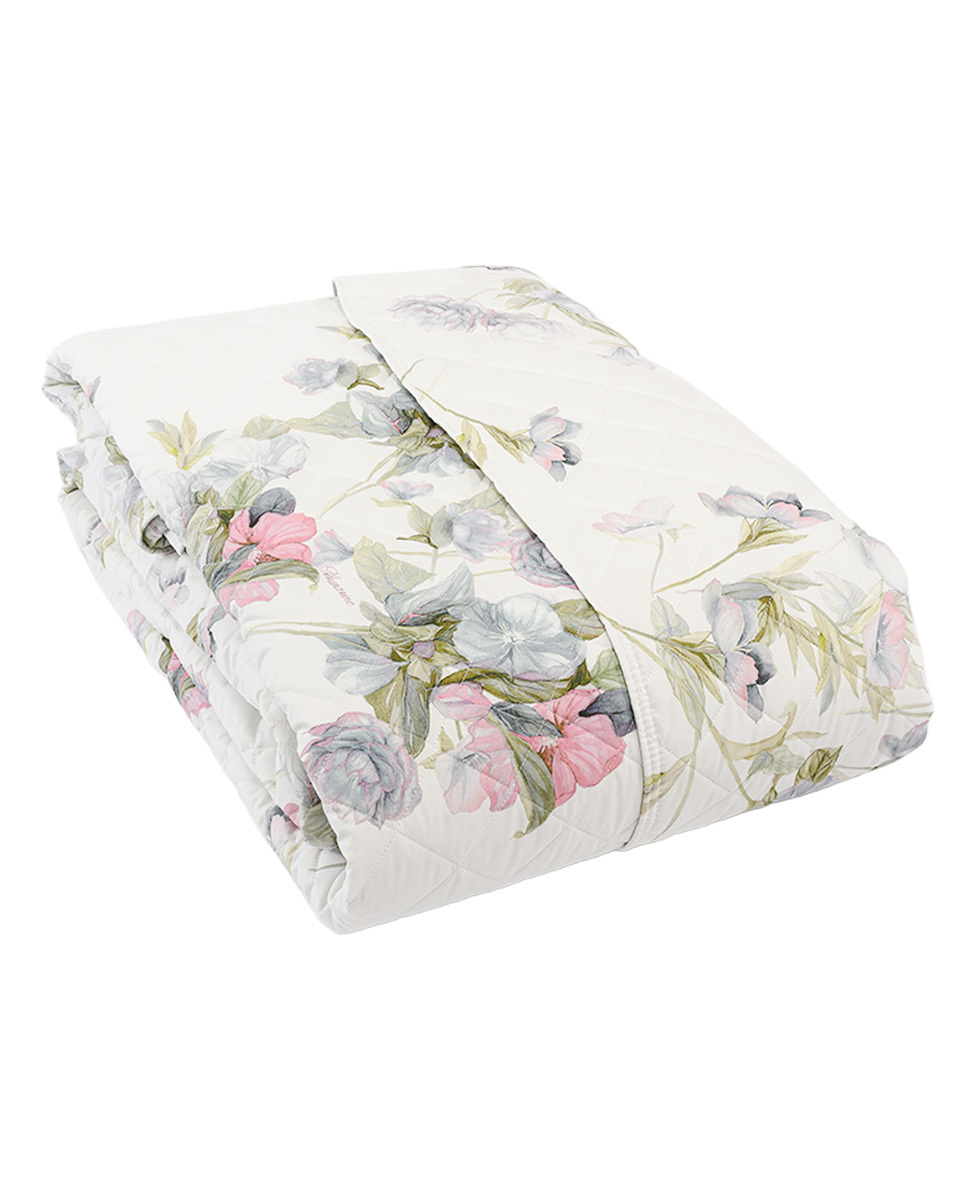 Copriletto matrimoniale trapuntato stampato all-over in percalle di cotone con logo Blumarine stampato nella trama.
