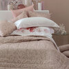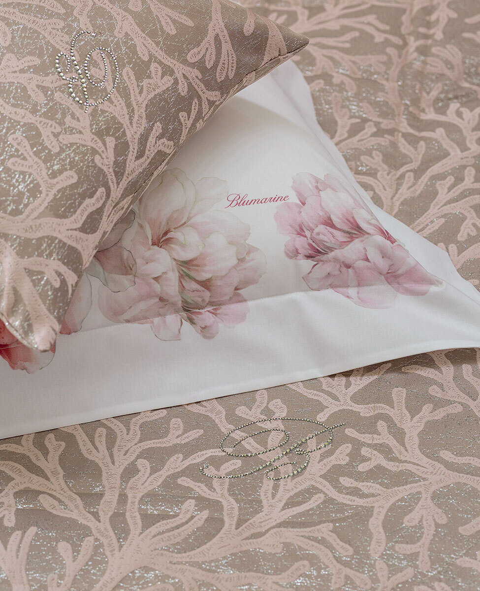 Copriletto matrimoniale trapuntato in tessuto jacquard con inserti di lurex e logo Blumarine in cristalli.