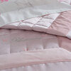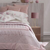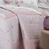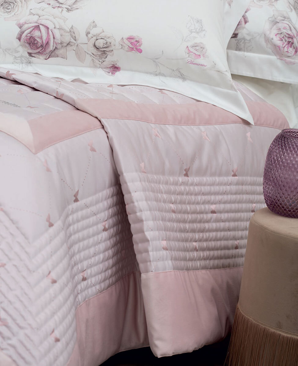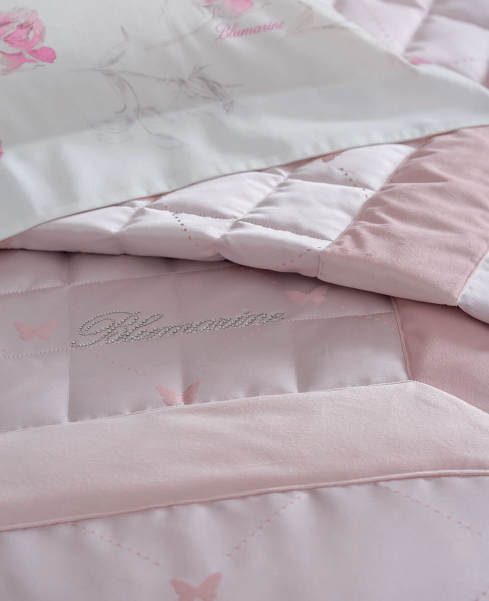 Copriletto matrimoniale costruito in jacquard tinto in filo con fasce in velluto rimesse in applicazione sul piano letto e in caduta su tre lati, logo Blumarine in cristalli.