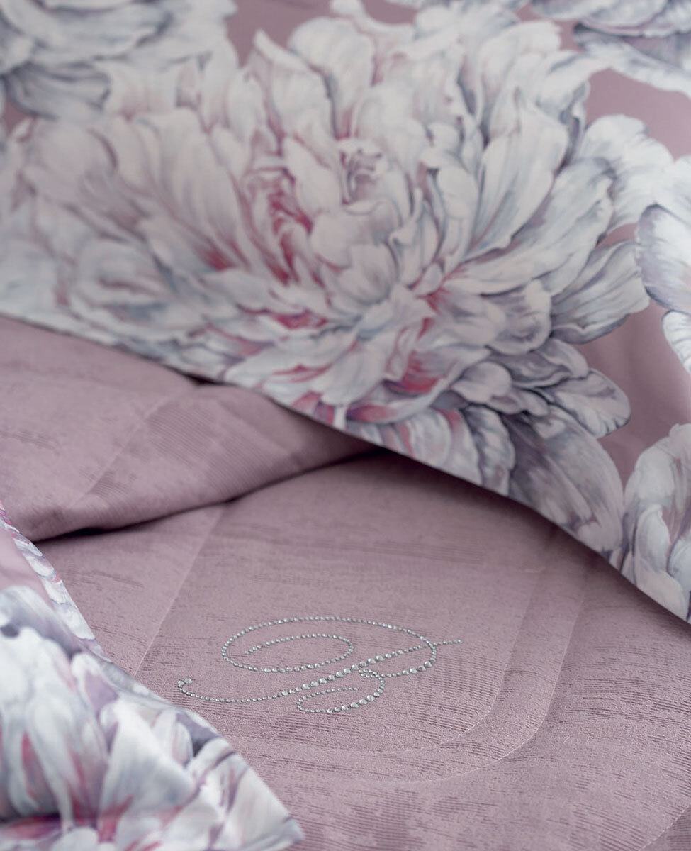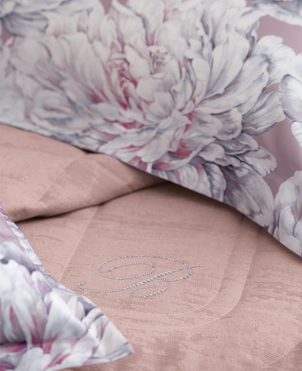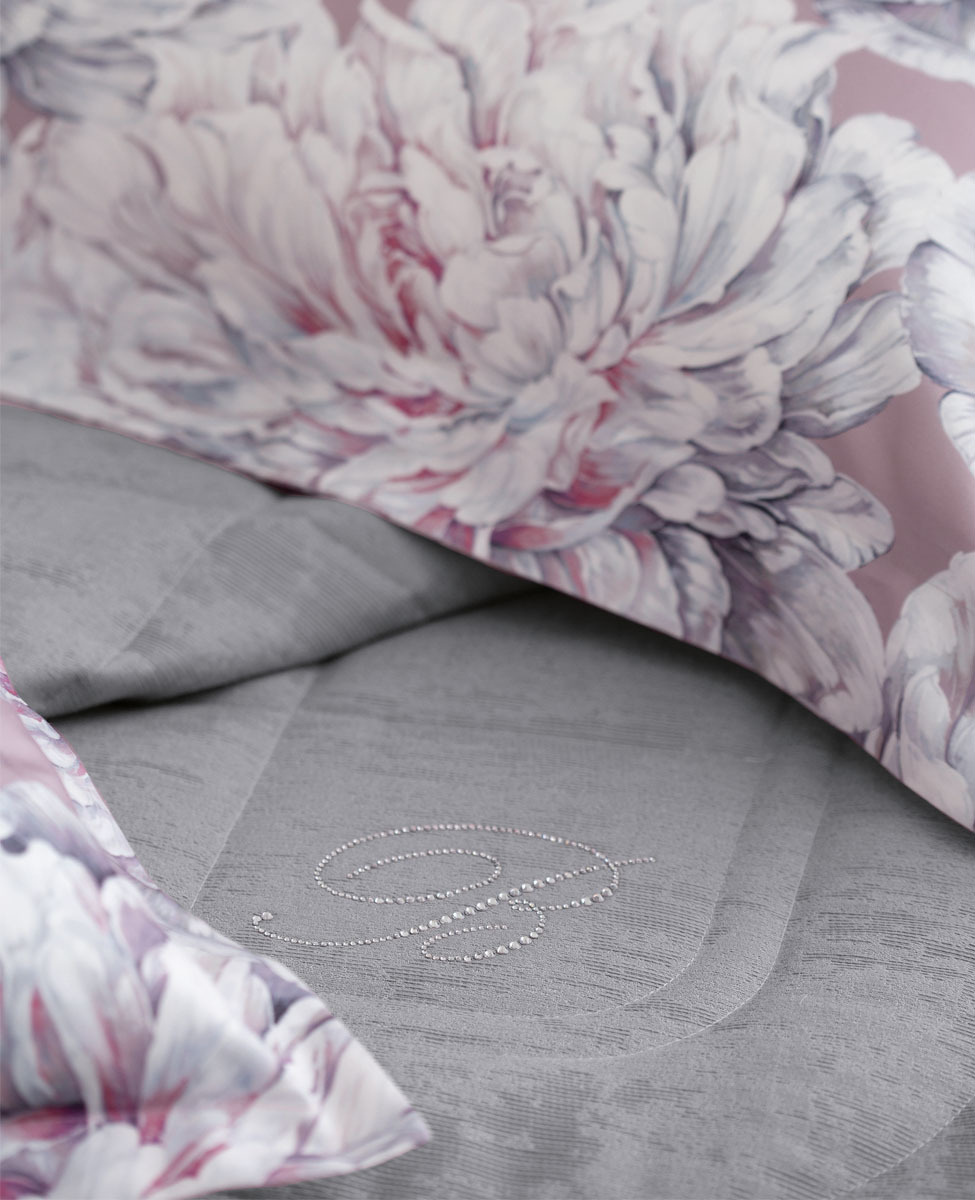 Copriletto matrimoniale in jacquard tinta unita effetto spazzolato con angolo stondato in caduta e logo Blumarine in cristalli.
