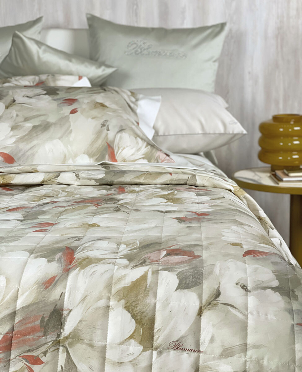 Copriletto trapuntato matrimoniale con stampa all-over su raso di cotone e logo Blumarine stampato nella trama.