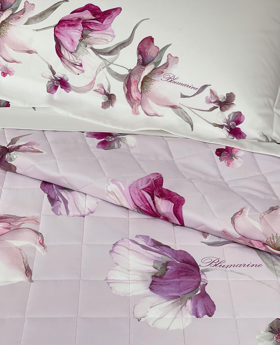 Copriletto trapuntato matrimoniale con stampa all-over su raso di cotone e logo Blumarine stampato nella trama.