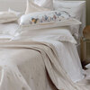Copriletto matrimoniale liscio, non trapuntato, in jacquard con logo Blumarine in cristalli e angolo stondato in caduta.