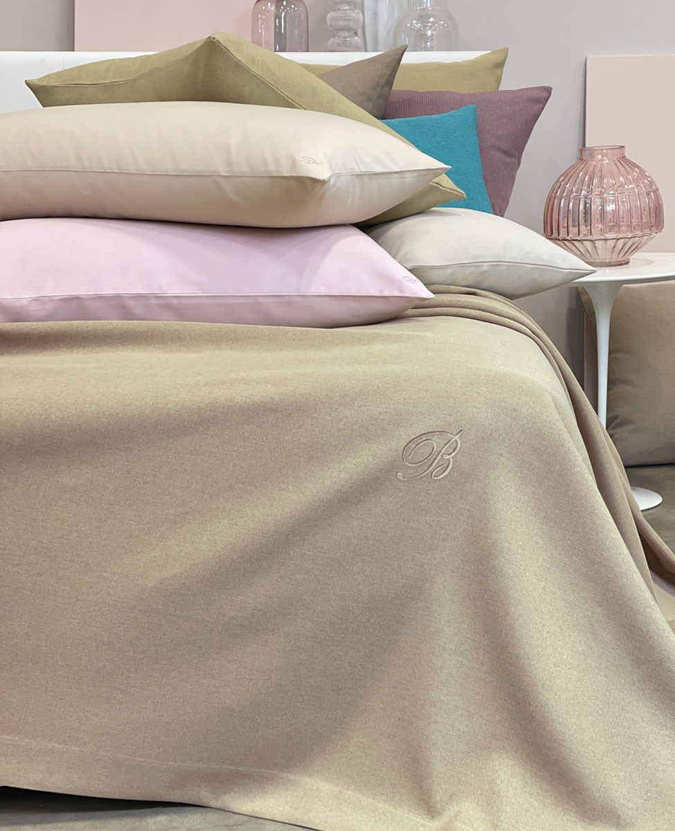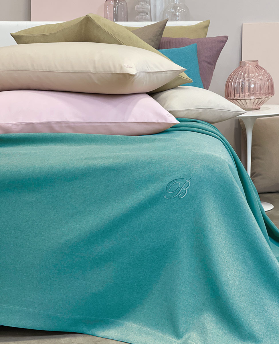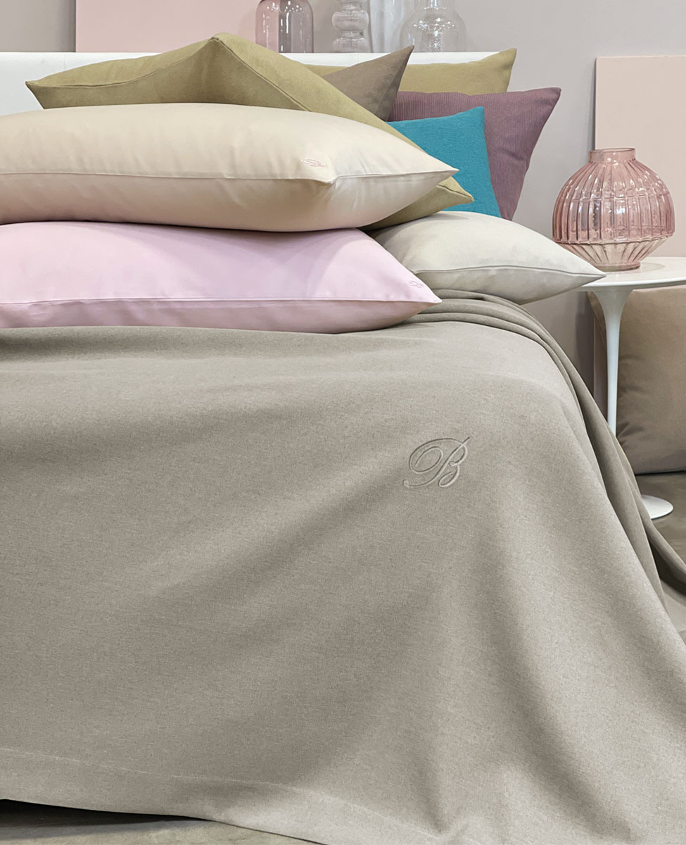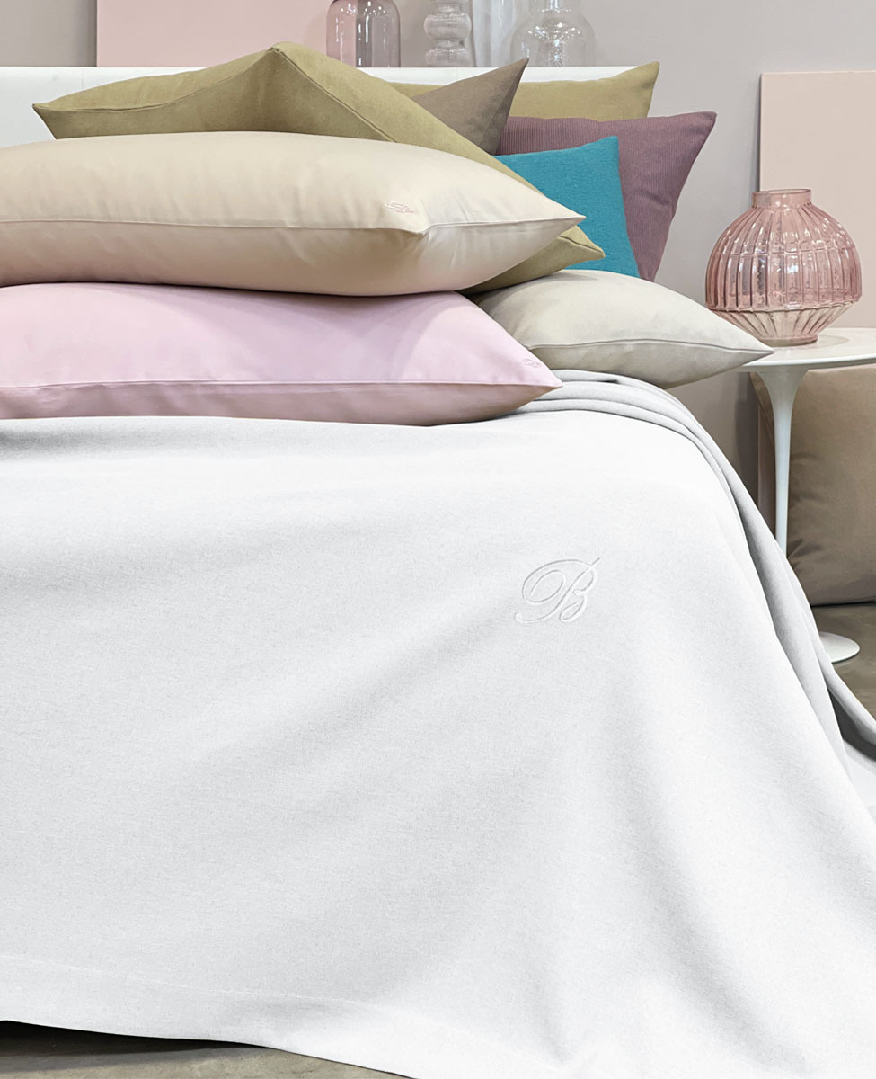 Copriletto liscio matrimoniale in tessuto tinto in filo con monogramma B ricamato applicato su patch termoadesivo.