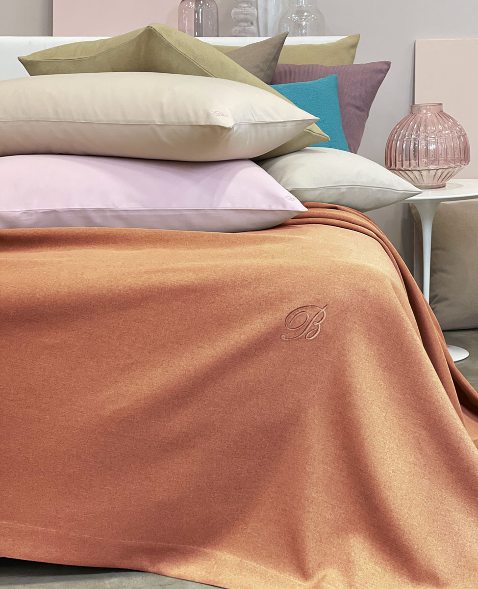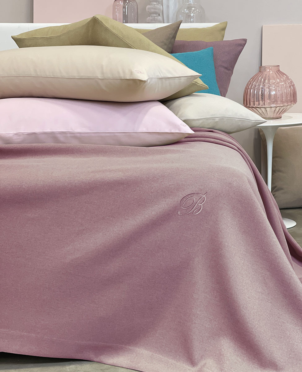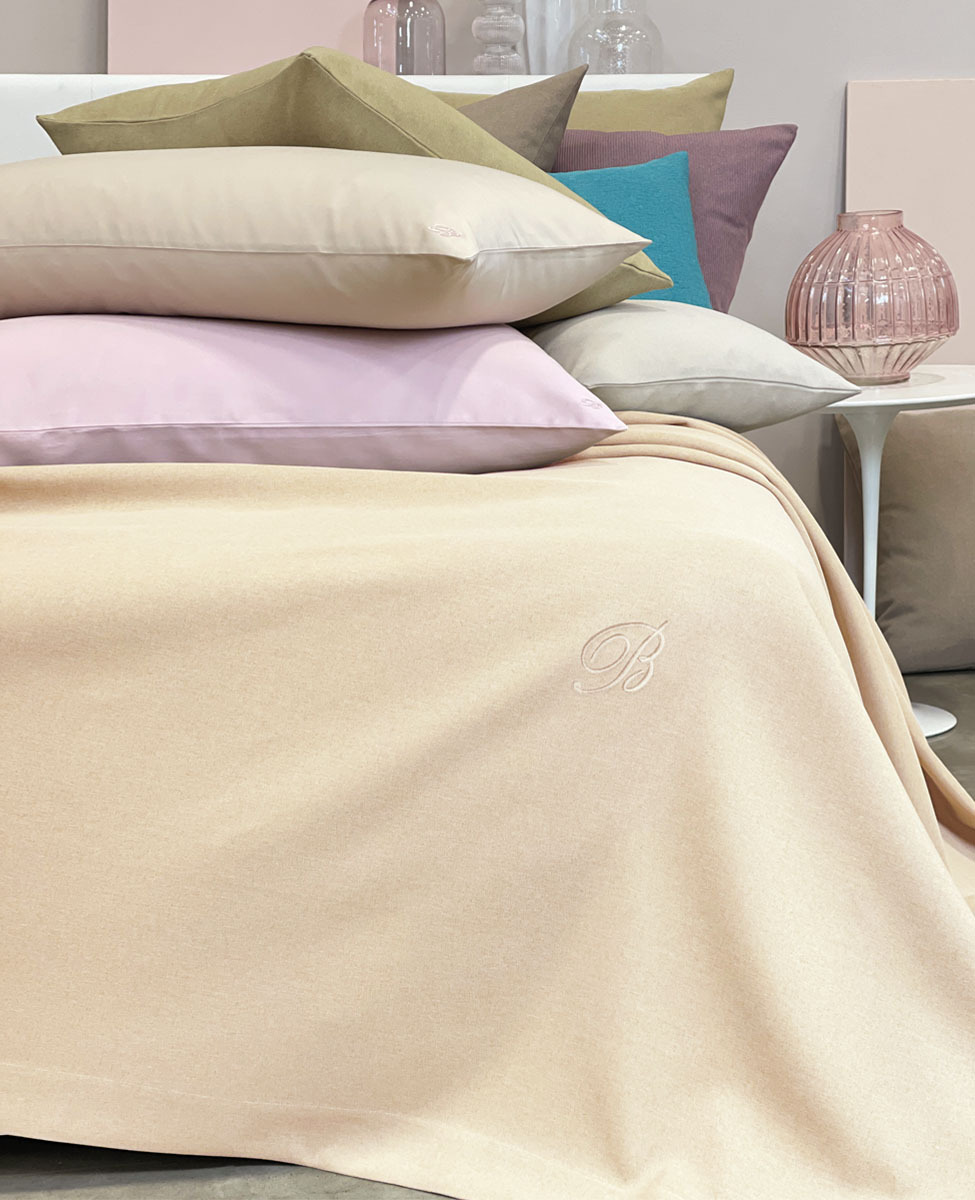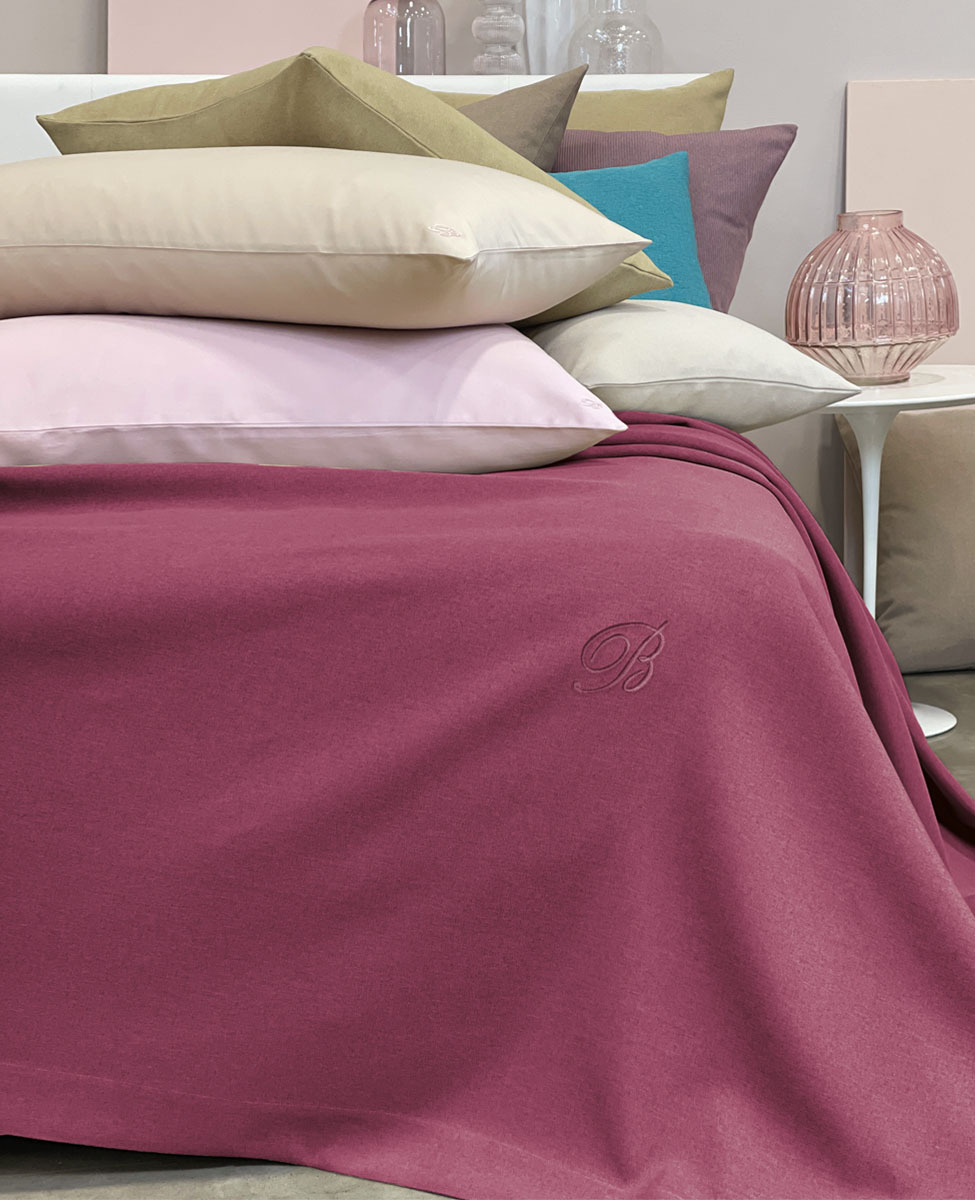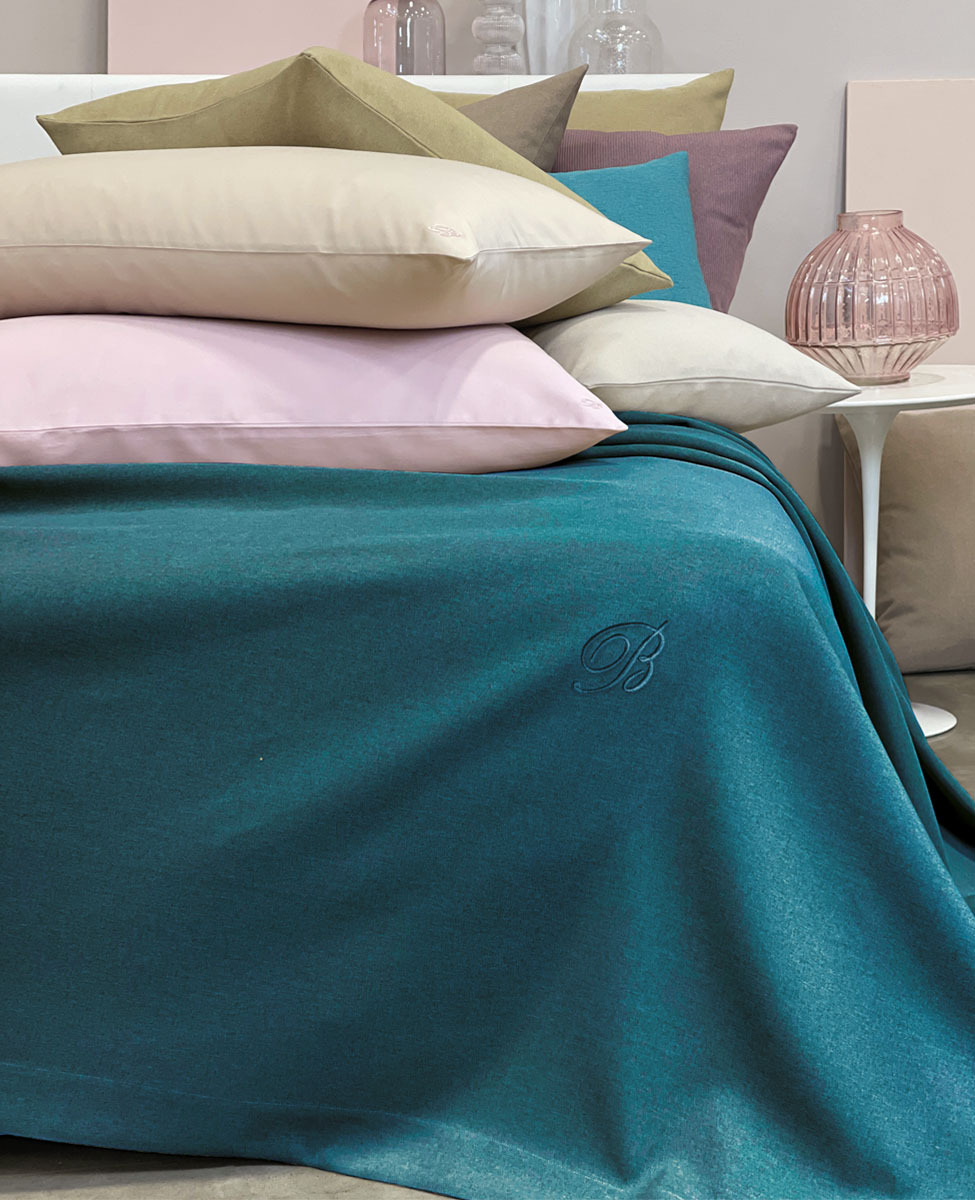 Copriletto liscio matrimoniale in tessuto tinto in filo con monogramma B ricamato applicato su patch termoadesivo.
