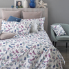 Completo xopripiumino per letto singolo con fresca stampa all over di fiori e farfalle in delicati toni pastello su federe a 4 volani e sopra sacca copripiumino, lenzuolo sotto in percalle di cotone tinta unita, logo BeBlumarine stampato nel pattern.