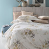 Completo copripiumino matrimoniale con fresca e delicata stampa all over su federe a 3 volani e sopra sacca copripiumino, lenzuolo sotto in percalle di cotone tinta unita, logo Blumarine stampato nel tessuto.