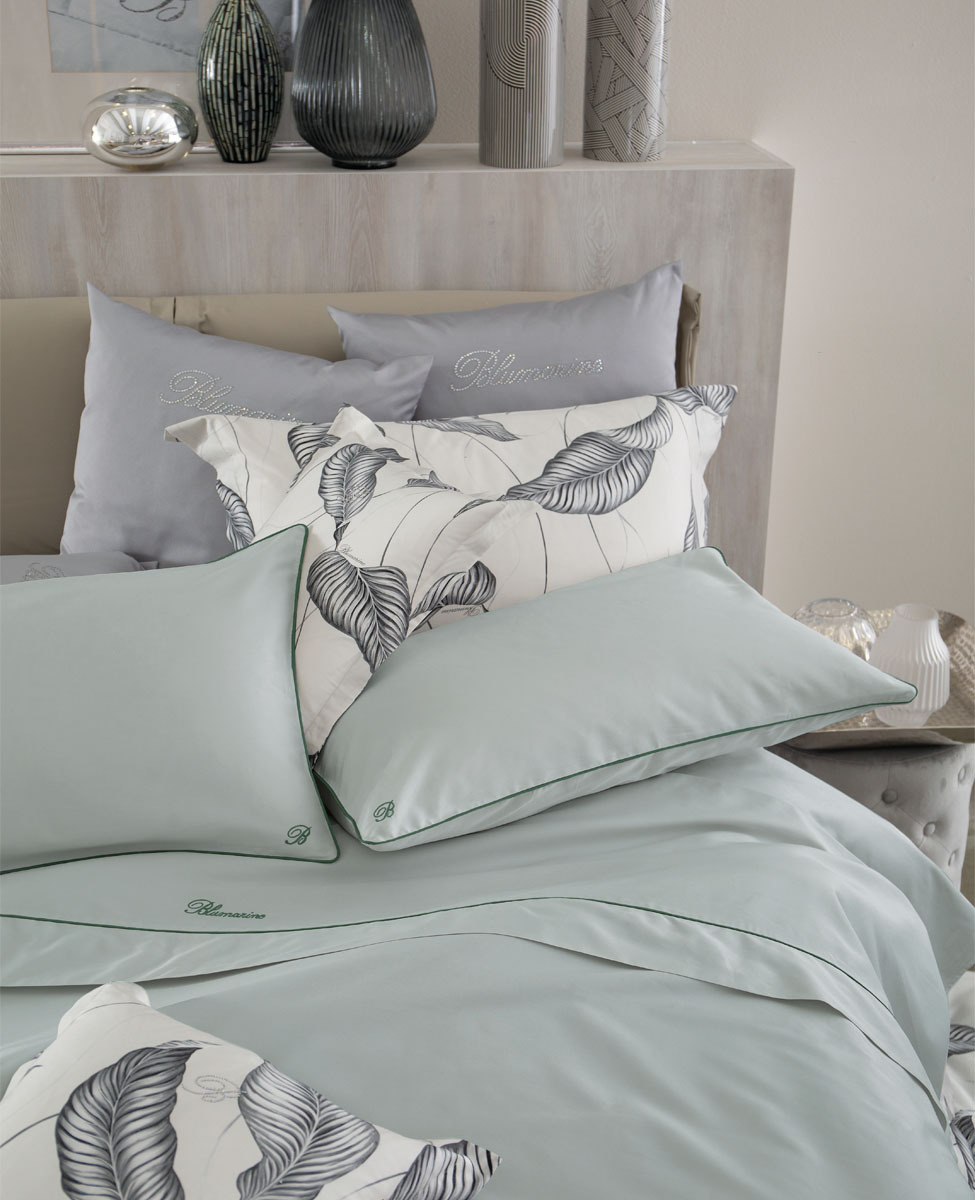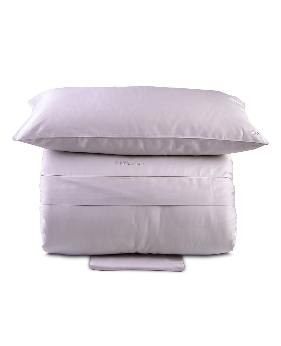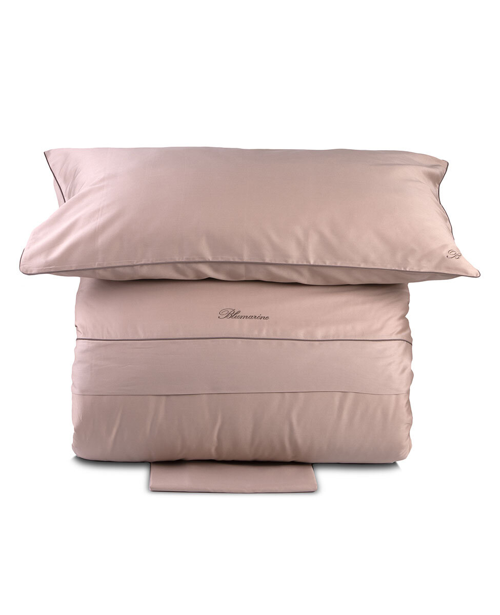 Completo copripiumino matrimoniale in raso di cotone tinta unita con profilo a contrasto, federe a sacchetto con logo monogramma B ricamato, sacca copripiumino con profilo colorato inserito sulla balza e logo Blumarine ricamato.
