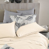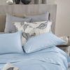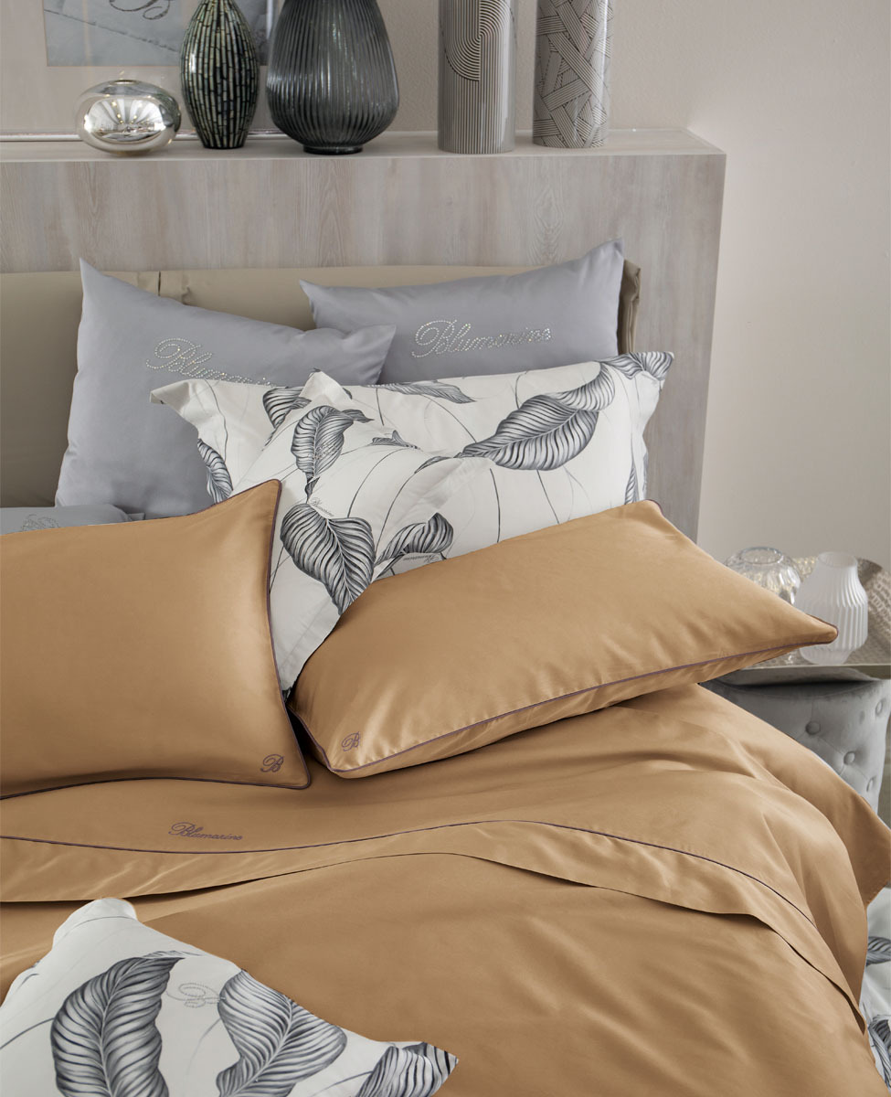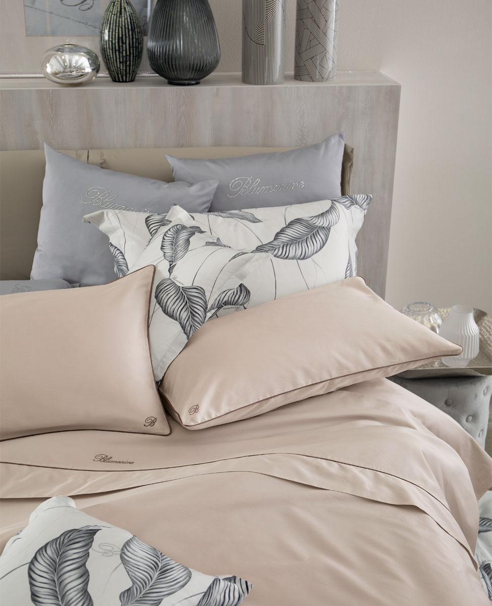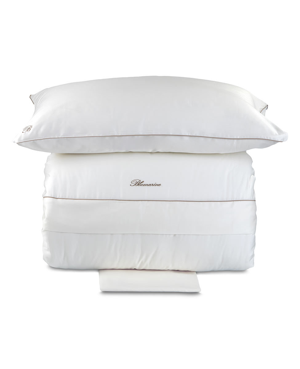 Completo copripiumino matrimoniale in raso di cotone tinta unita con profilo a contrasto, federe a sacchetto con logo monogramma B ricamato, sacca copripiumino con profilo colorato inserito sulla balza e logo Blumarine ricamato.