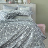 Completo copripiumino matrimoniale con stampa all over su federe e sopra sacca copripiumino, lenzuolo sotto in raso di cotone tinta unita.