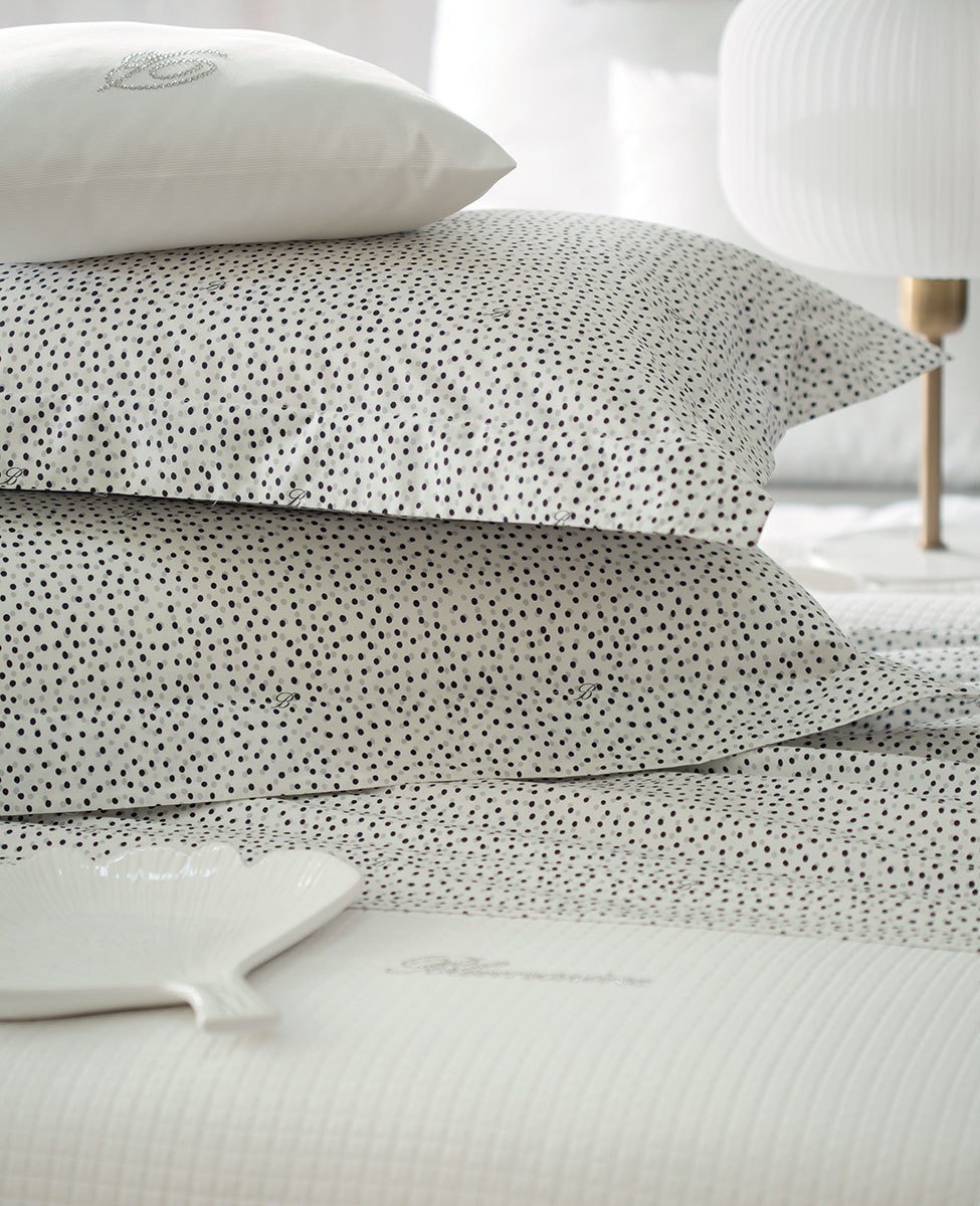 Parure copripiumino 2 pz per letto singolo con stampa all over stampa all over su federa a 3 volani e sopra sacca copripiumino, con logo Blumarine nella trama.