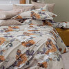 Completo copripiumino matrimoniale in raso con stampa all-over su federe a 3 volani e sopra sacca copripiumino, lenzuolo sotto in raso tinta unita, logo Blumarine stampato nella trama.