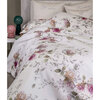 Parure copripiumino matrimoniale in raso con stampa all-over, federe a 3 volani con stampa piazzata, sotto sacca e lenzuolo sotto in raso tinta unita, logo Blumarine stampato nel tessuto.