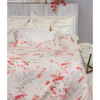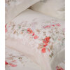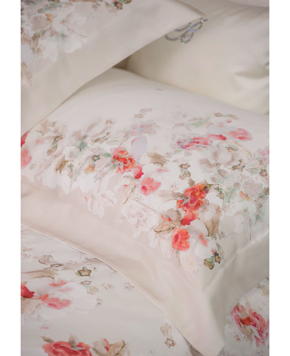Parure copripiumino matrimoniale 3 pezzi in raso con stampa all-over, federe a 3 volani con stampa piazzata, sotto sacca e lenzuolo sotto in raso tinta unita, logo Blumarine stampato nella trama.