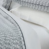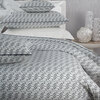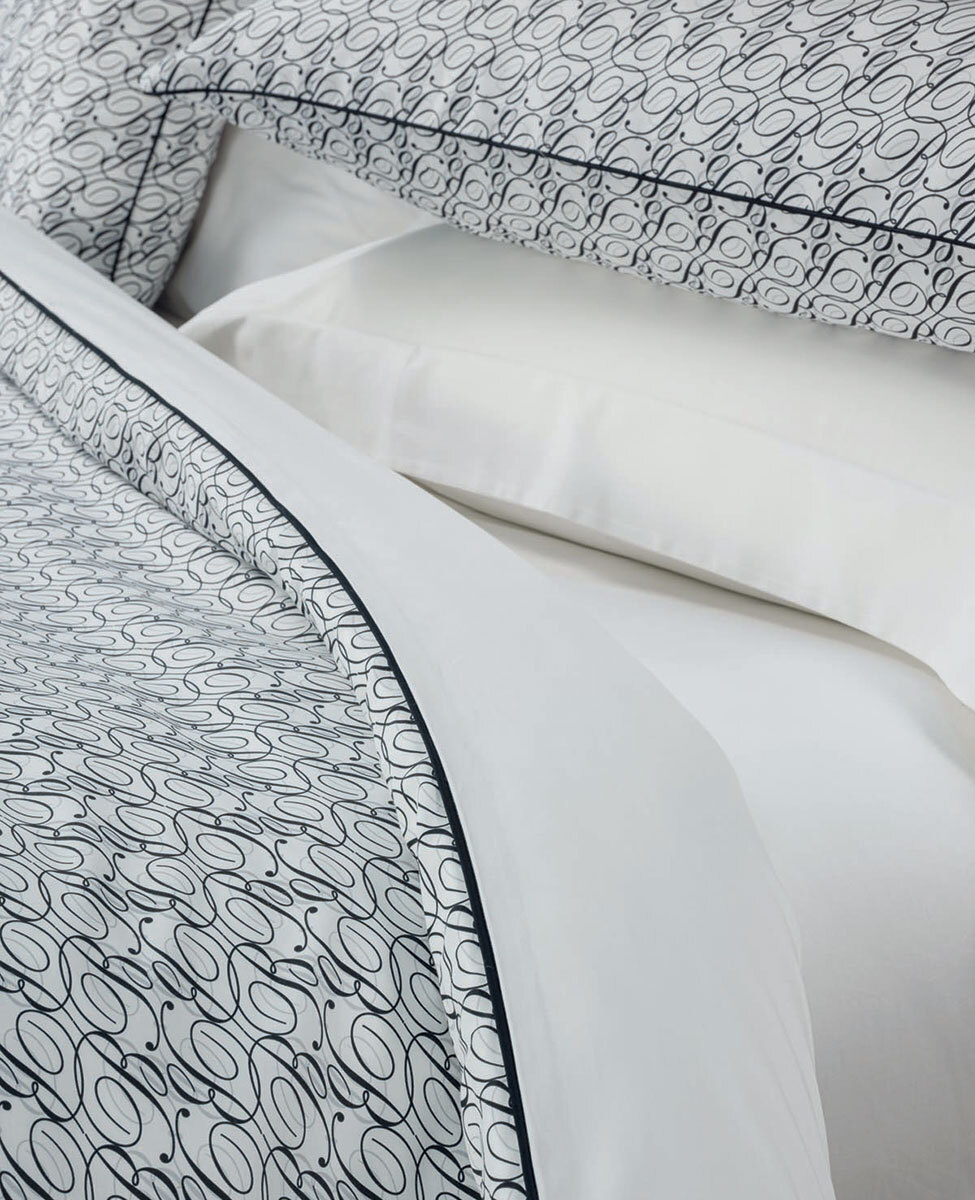 Completo copripiumino matrimoniale con stampa monogramma B all-over in raso di cotone, federe a sacchetto e sacca copripiumino rifinite con piping a contrasto, sottosacca in raso tinta unita, lenzuolo sotto in raso tinta unita.