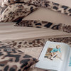 Completo lenzuola matrimoniale in raso tinta unita con bordi stampati rimessi in applicazione con stampa animalier, lenzuolo sotto in raso di cotone tinta unita.