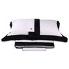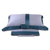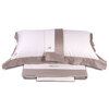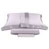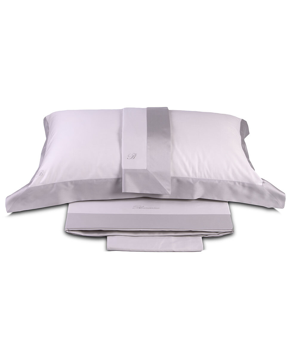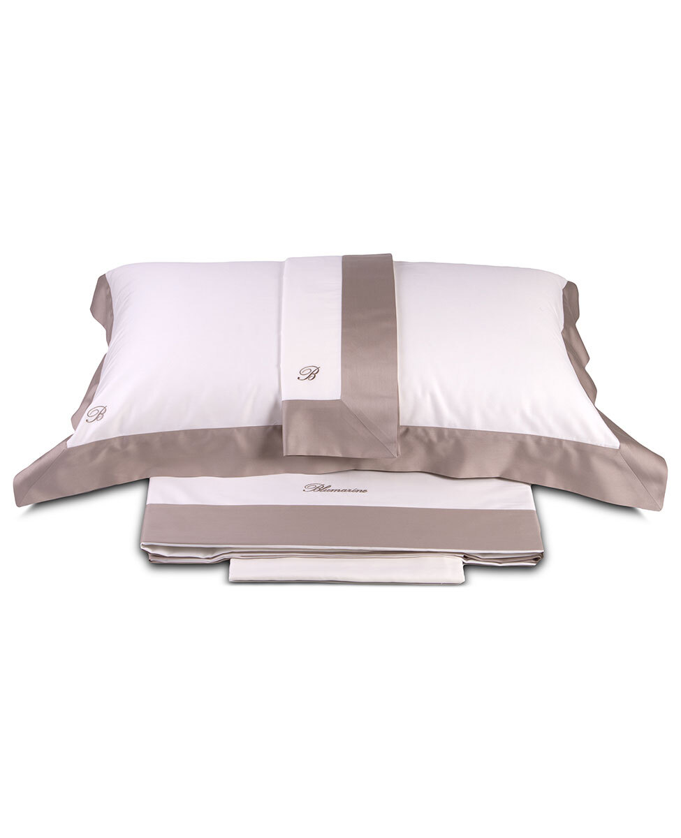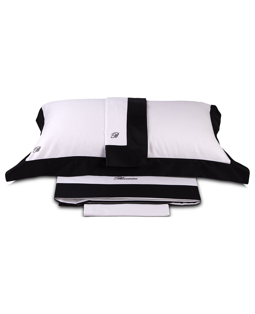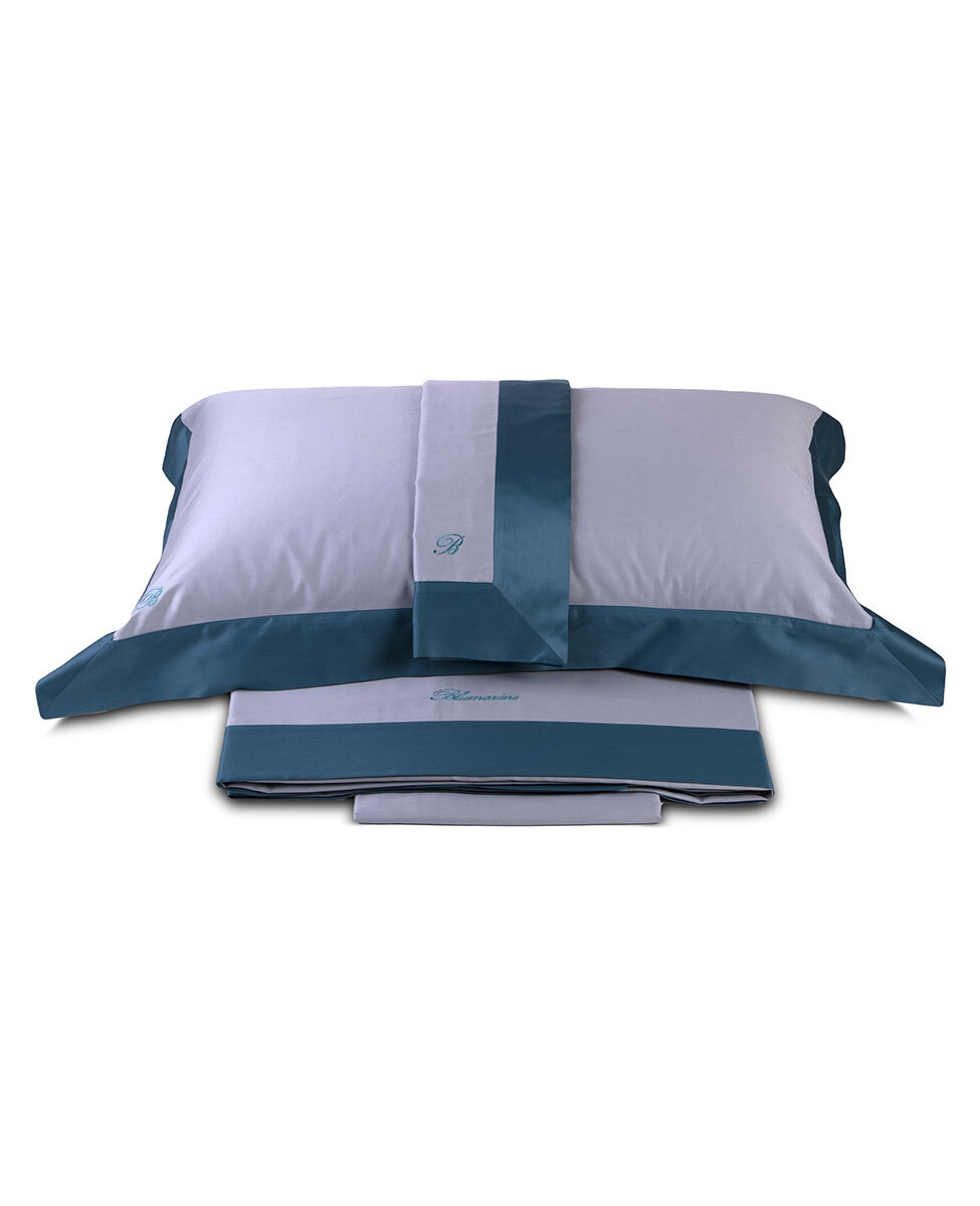 Completo lenzuola matrimoniale in raso di cotone tinta unita con fasce in colore a contrasto rimesse in applicazione e logo ricamato su lenzuolo sopra e federe.