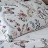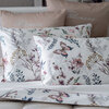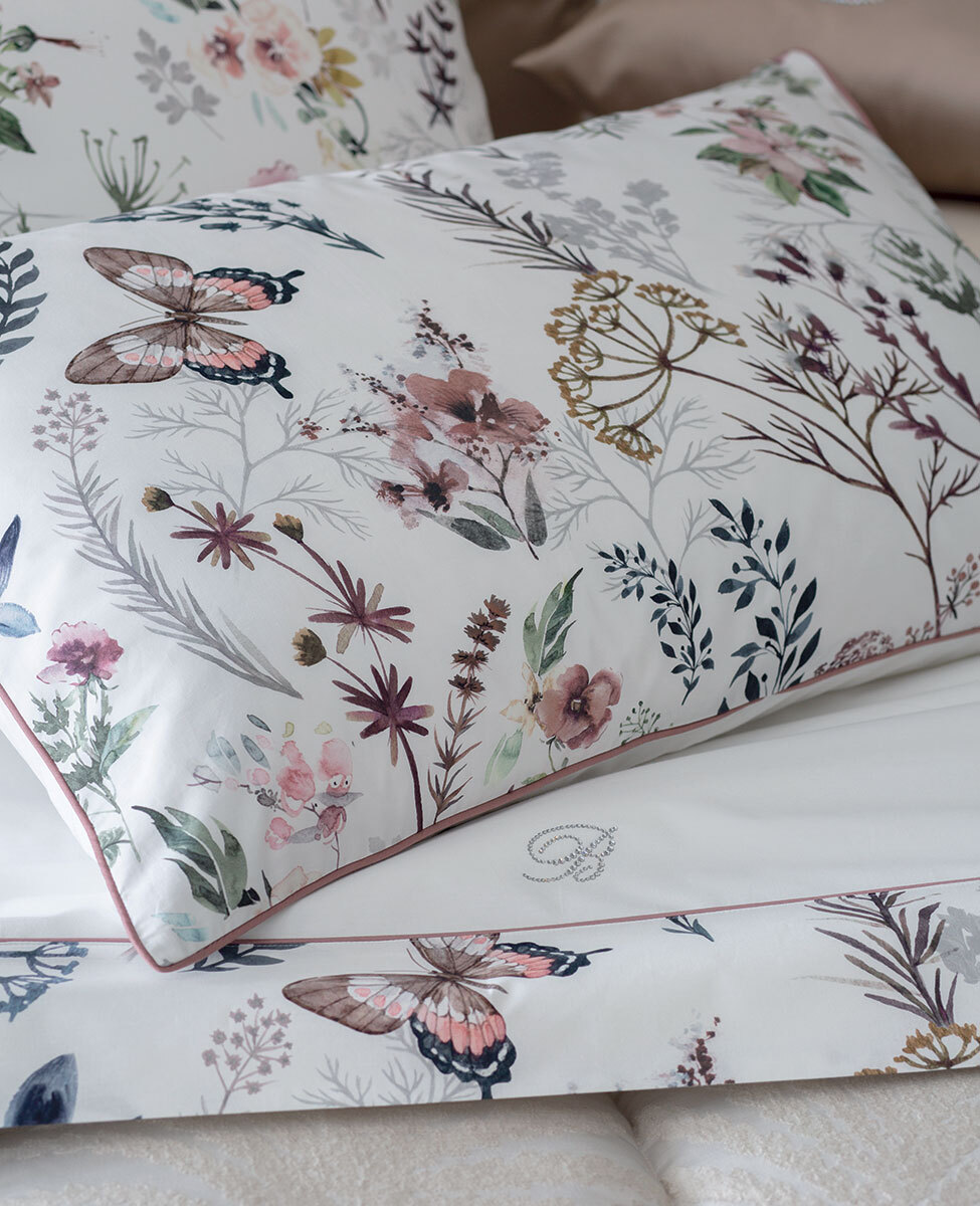Completo lenzuola matrimoniale in percalle stampato, federe a sacchetto con fronte stampato e retro tinta unita, rifinite con profilo colorato, lenzuolo sopra con bordo stampato rifinito con profilo colorato e logo Blumarine in cristalli.