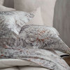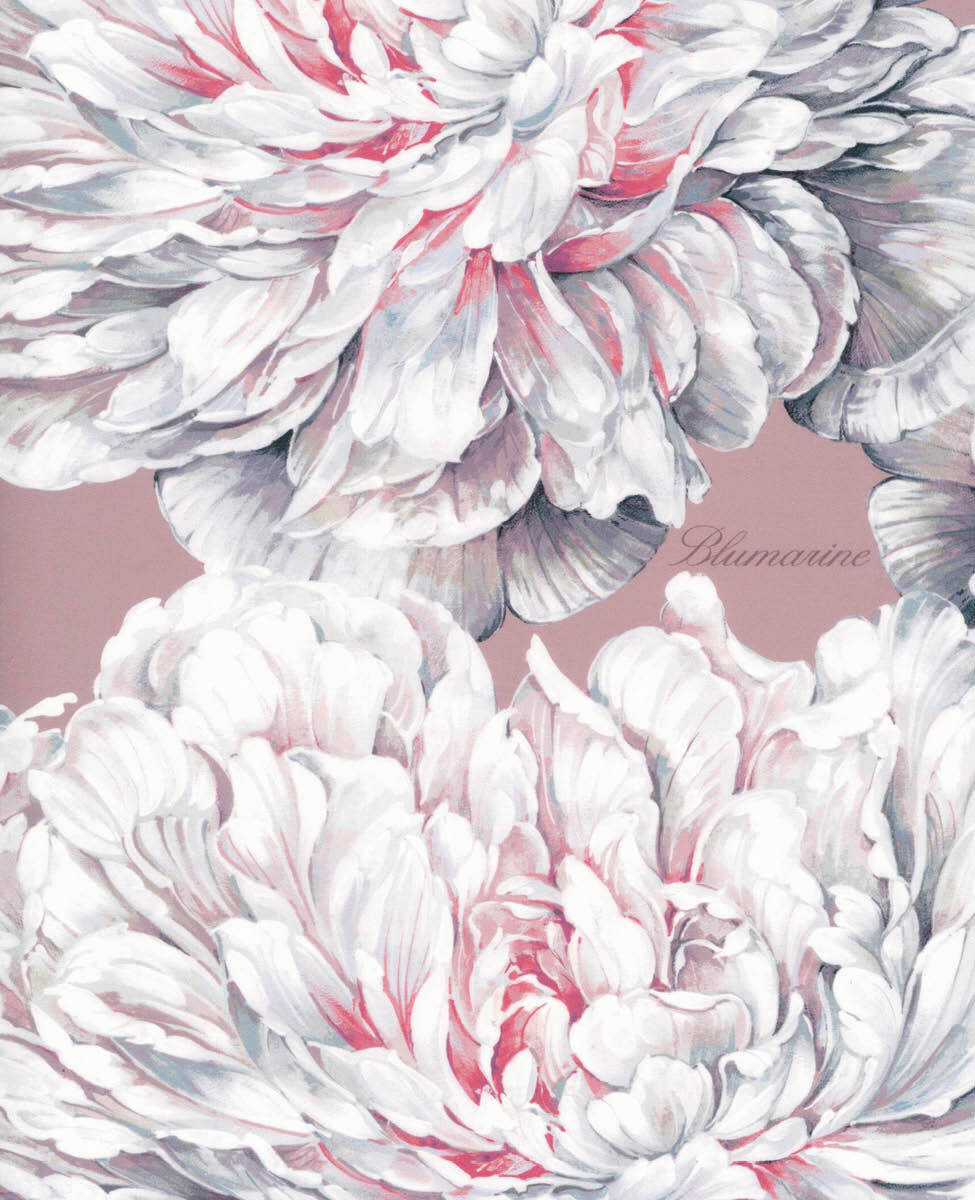 Completo lenzuola matrimoniale in raso con stampa all-over su federe a 3 volani e sul lenzuolo sopra, lenzuolo sotto in raso tinta unita, logo Blumarine stampato nella trama.