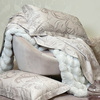 Completo lenzuola matrimoniale in raso con stampa all-over su federe a 3 volani e lenzuolo sopra, lenzuolo sotto in raso tinta unita, logo Blumarine stampato nella trama.