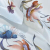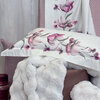 Completo lenzuola matrimoniale in raso con stampa piazzata su lenzuolo sopra e su federe a 3 volani, lenzuolo sotto in raso tinta unita, logo Blumarine stampato nella trama.