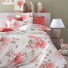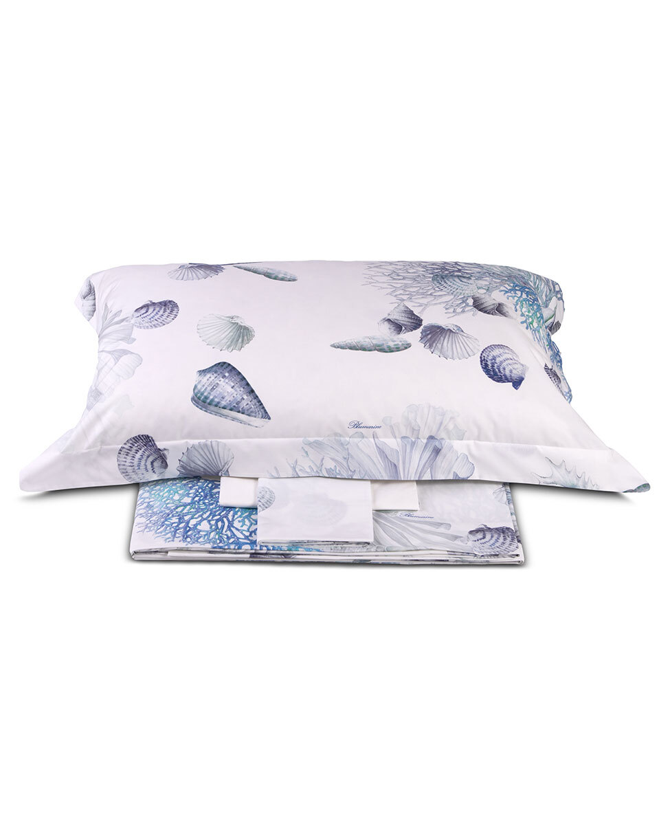Completo lenzuola-copriletto estivo matrimoniale in percalle stampato all over con logo Blumarine nella trama, lenzuolo sotto in percalle di cotone tinta unita.