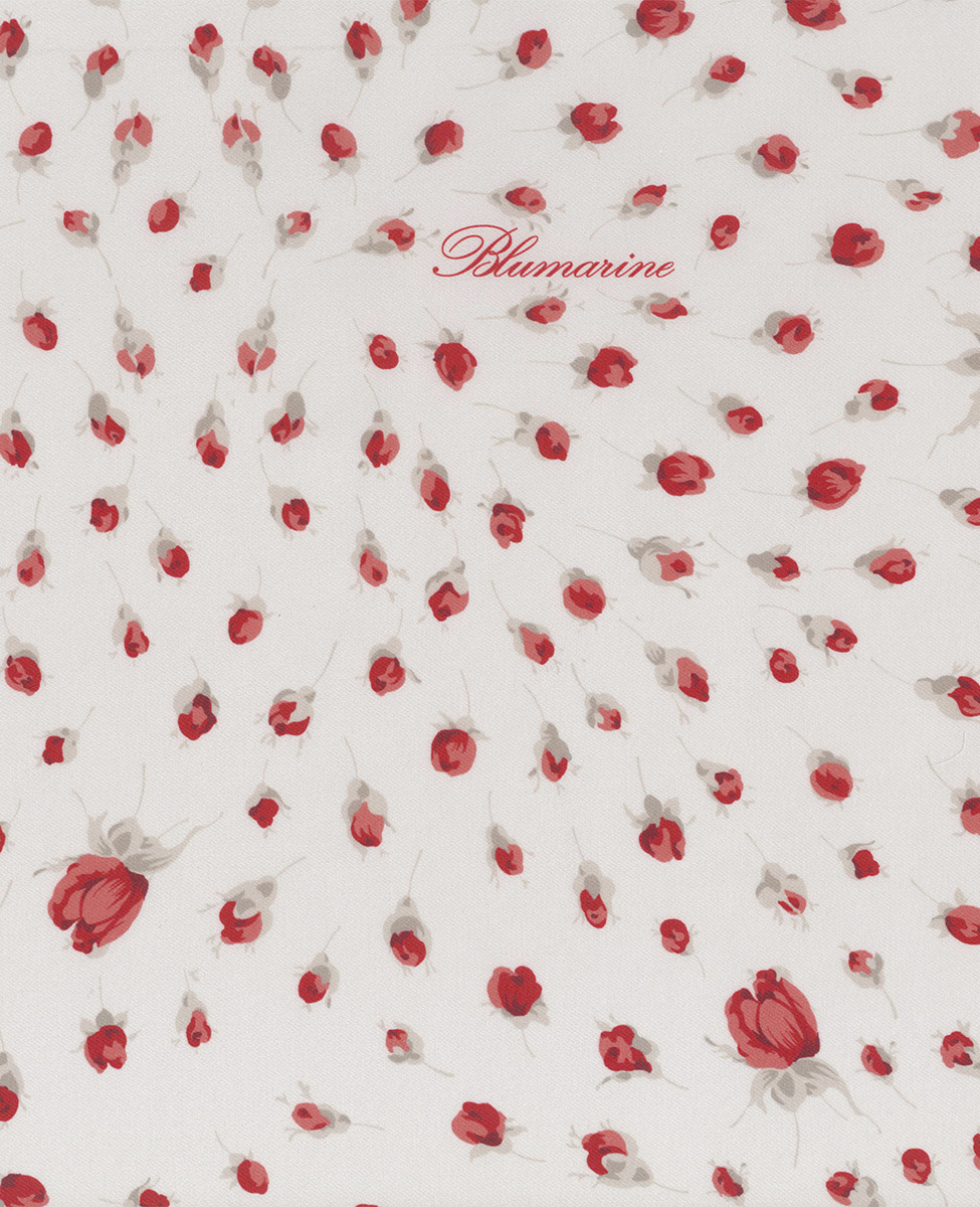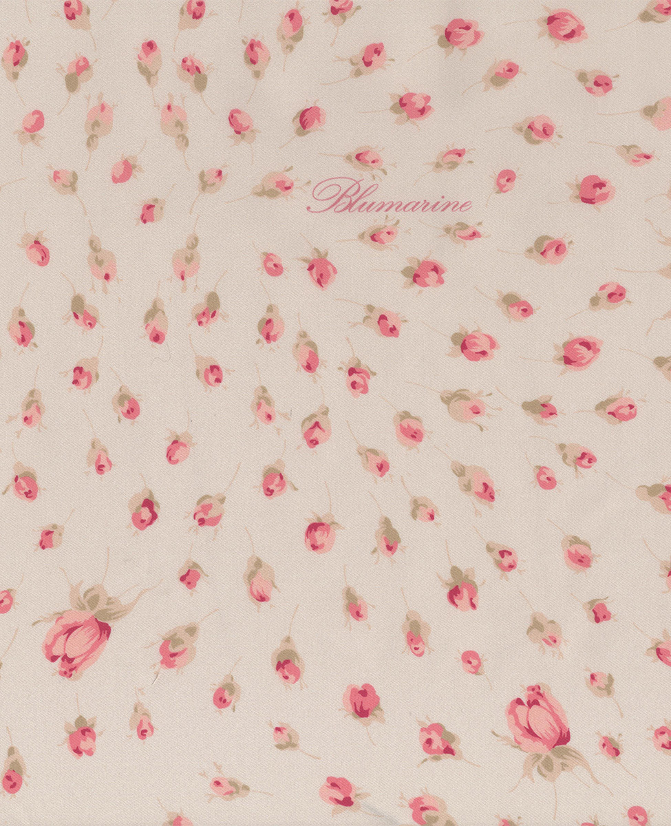 Completo lenzuola matrimoniale modello copriletto con doppia stampa piazzata, federe a 3 volani con stampa piazzata, lenzuolo sotto in raso tinta unita, logo Blumarine stampato nella trama.