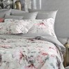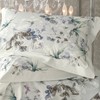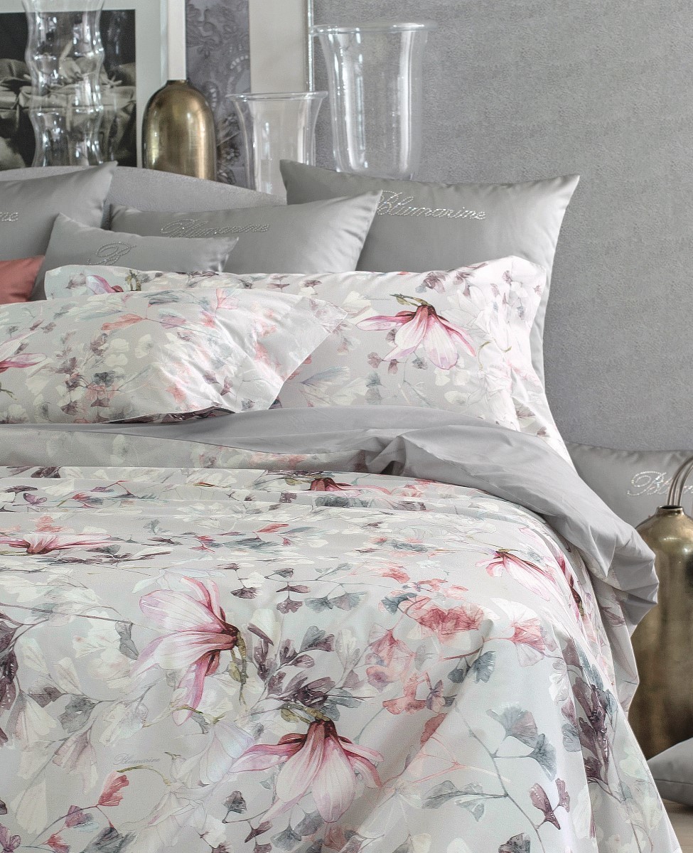 Completo lenzuola matrimoniale con fresca e delicata stampa all-over, lenzuolo sotto in percalle di cotone tinta unita, logo Blumarine stampato nella trama.