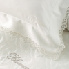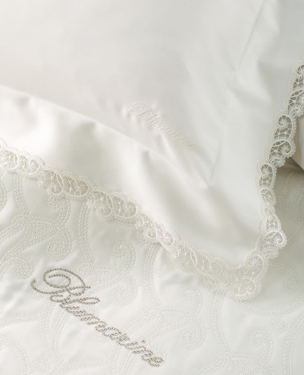 Prezioso completo lenzuola matrimoniale in puro raso di cotone con liste di tulle ricamato e logo Blumarine ricamato, federe a 3 volani con liste rimesse ad intarsio, lenzuolo sopra con lista cucita in applicazione e logo Blumarine ricamato.