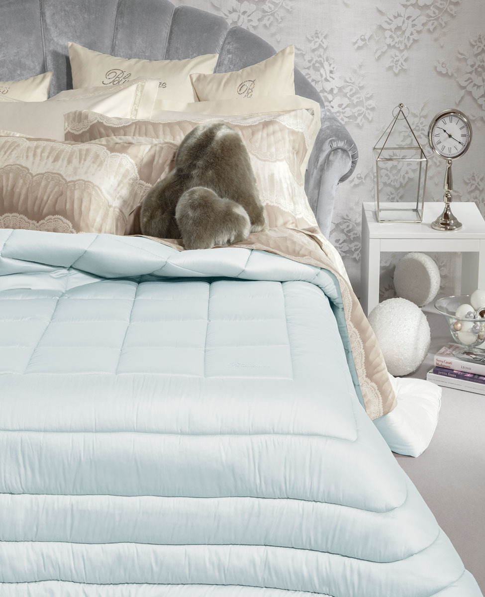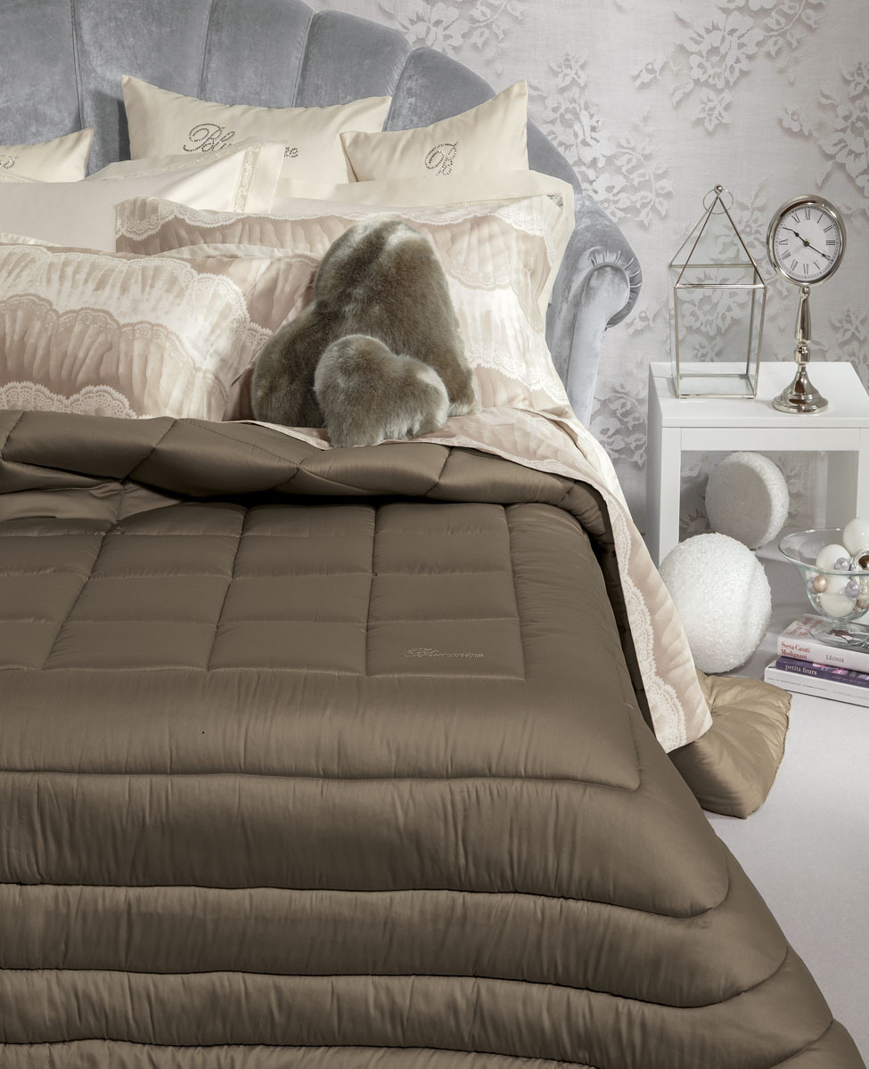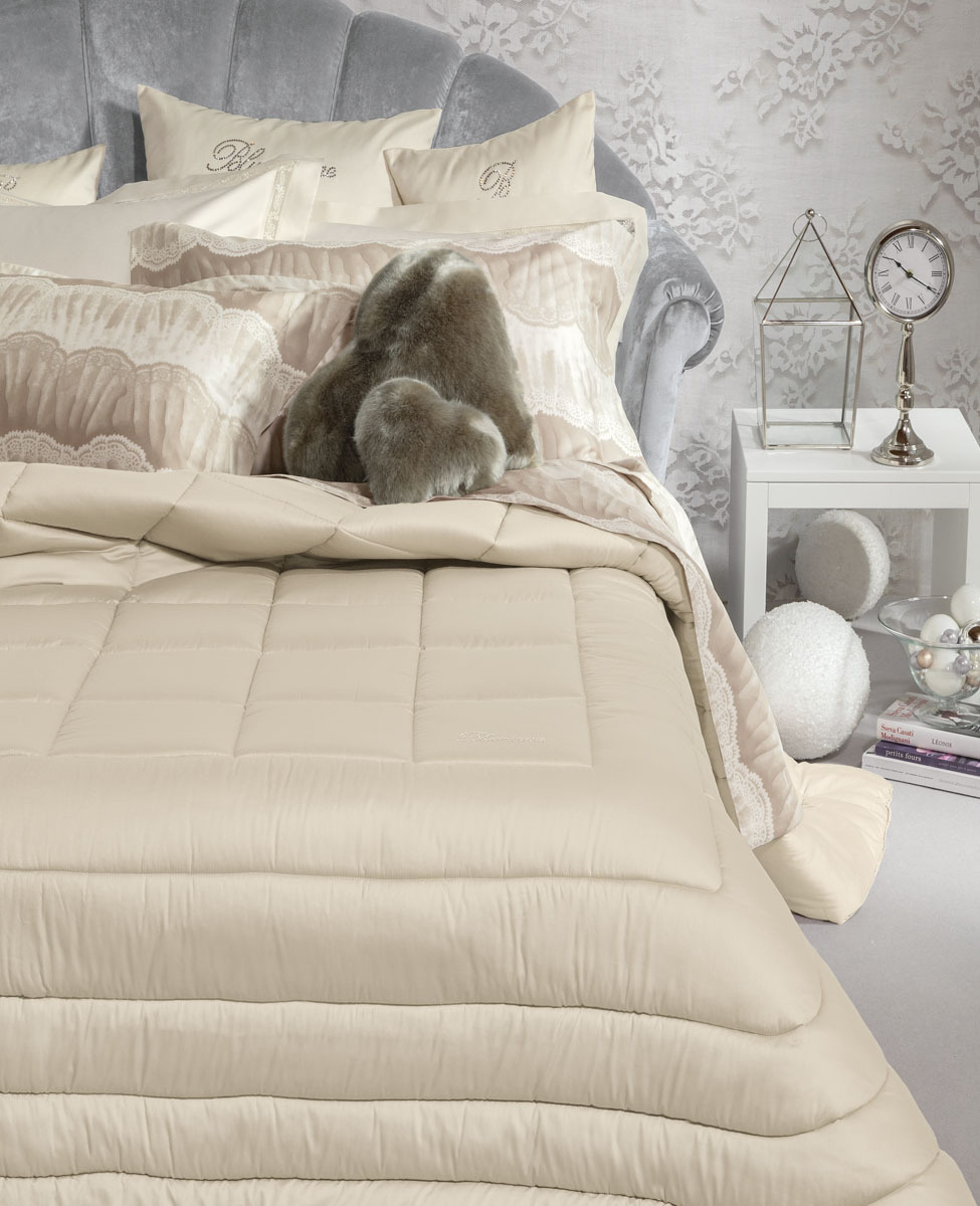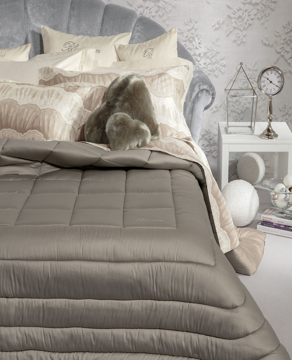Trapunta matrimoniale trapuntata in puro raso di cotone tinta unita con logo Blumarine in cristalli Swarovski.