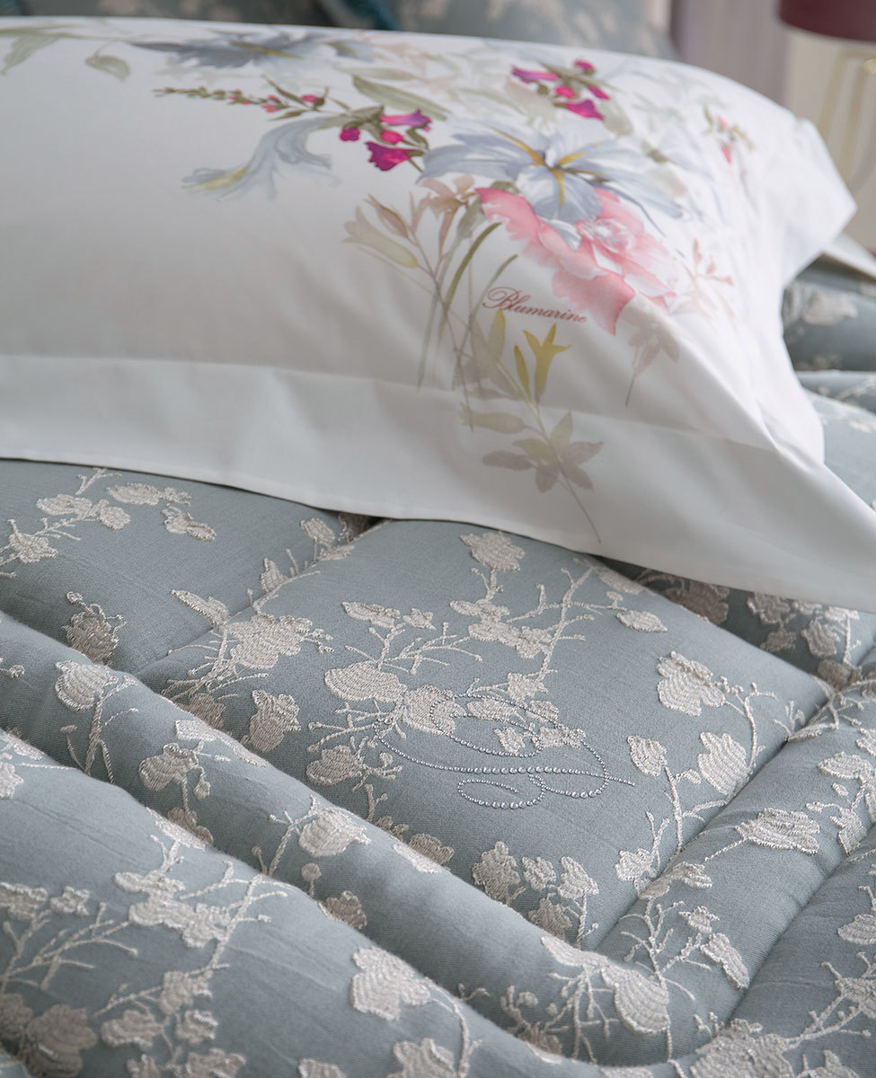 Calda trapunta matrimoniale con delicato disegno jacquard e logo Blumarine in cristalli.