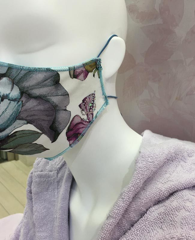 Mascherina costruita con elastici giro testa colorati. Logo in cristalli.