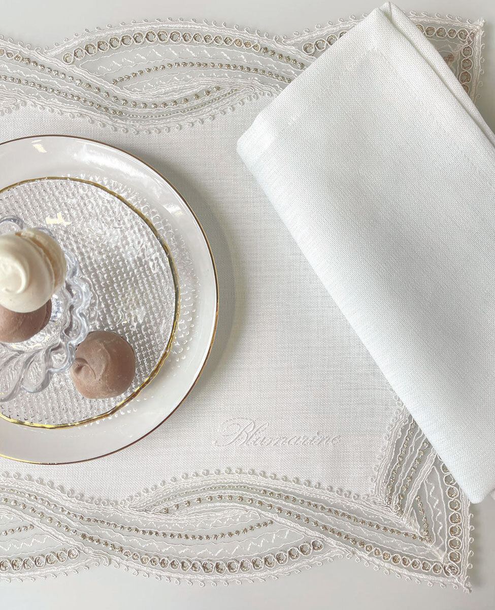 Set tovaglietta americana con pizzo macramè rimesso ad intarsio sui 4 lati e tovagliolo semplice, logo Blumarine ricamato.