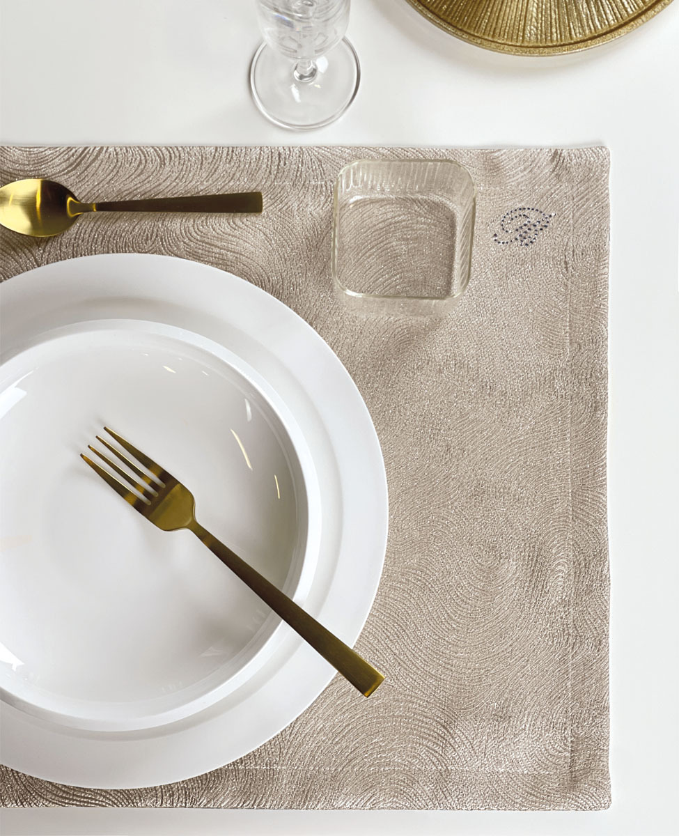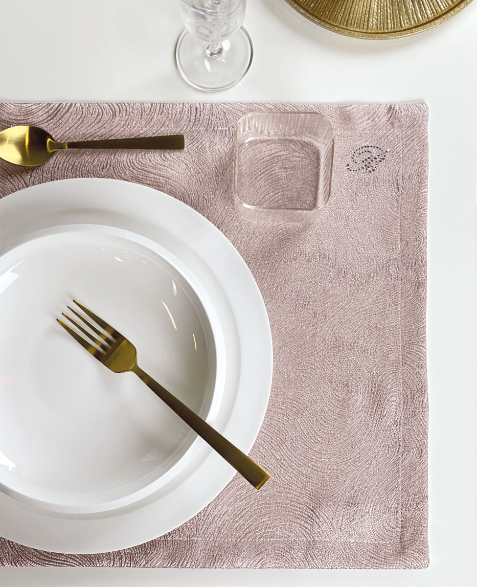 Set di due tovagliette in tessuto jacquard rifinito con angoli a cappuccio e logo Blumarine in cristalli.