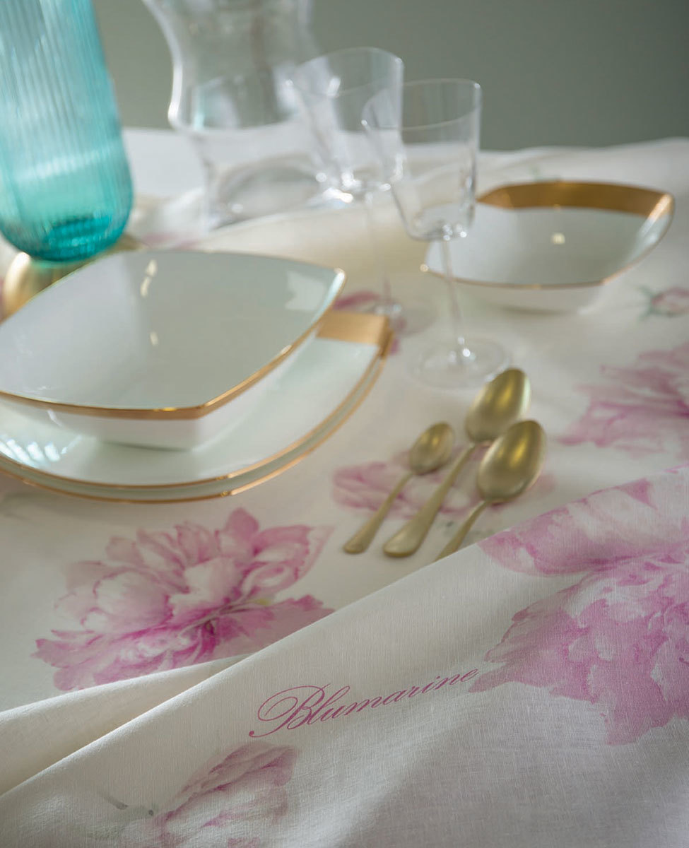 Tovaglia per 10/12 posti in lino con stampa floreale piazzata e logo Blumarine nella trama, elegantemente confezionata in scatola, perfetta come idea regalo.