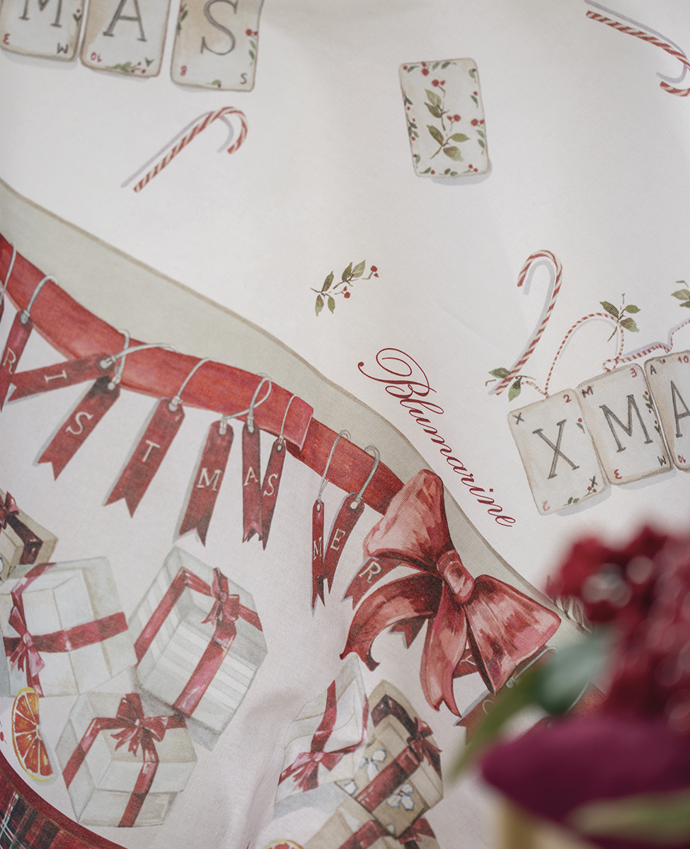 Tovaglia da 10/12 posti in panama con stampa natalizia piazzata e logo Blumarine, elegantemente confezionata in scatola, perfetta come idea regalo.