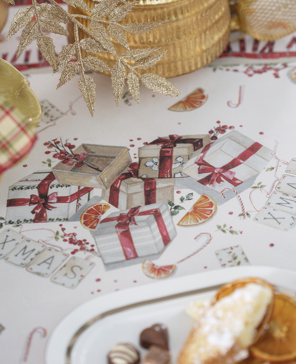 Copritavolo in panama con stampa natalizia piazzata e logo Blumarine nella trama.