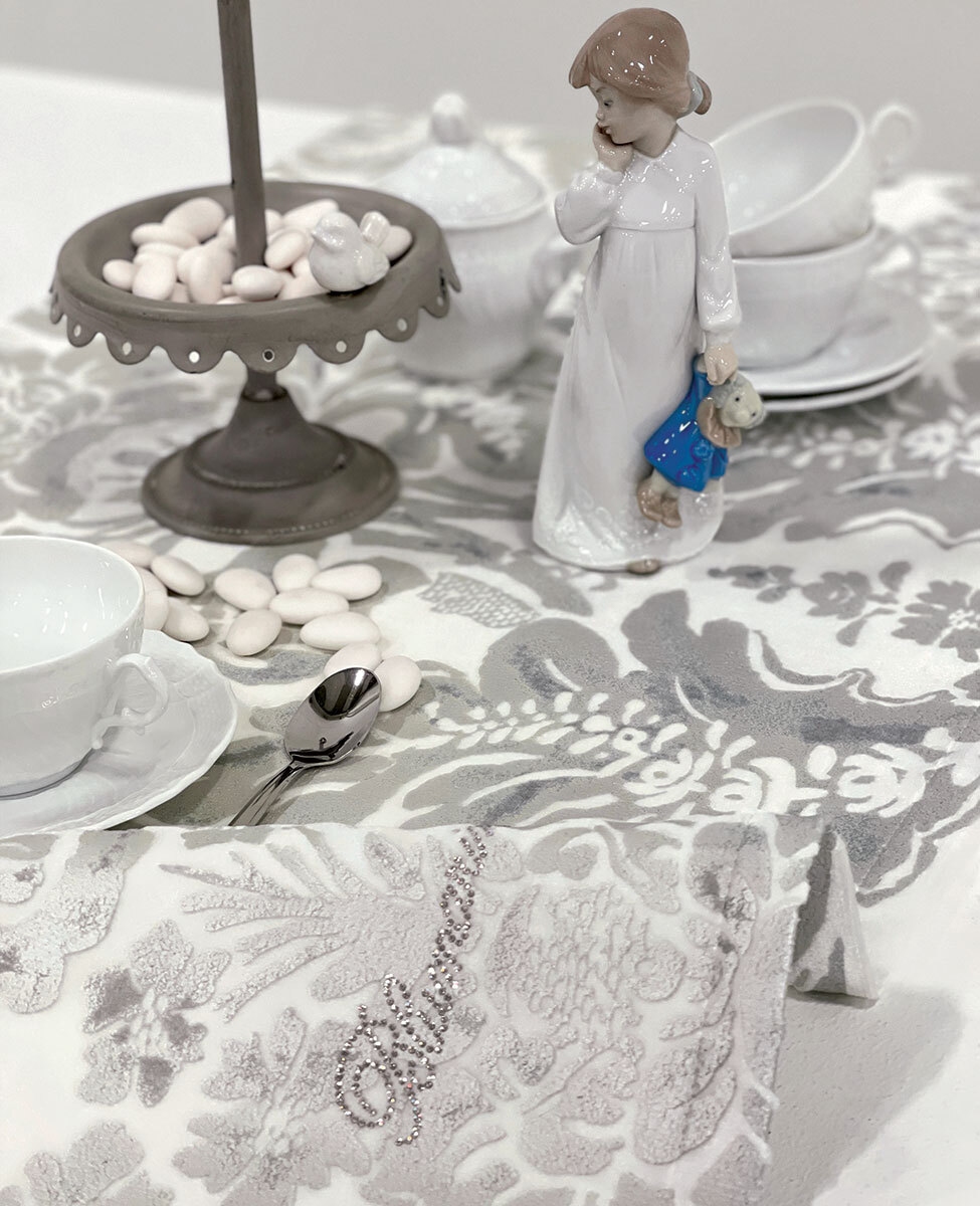 Copritavolo in velluto stampato e logoBlumarine in cristalli.
