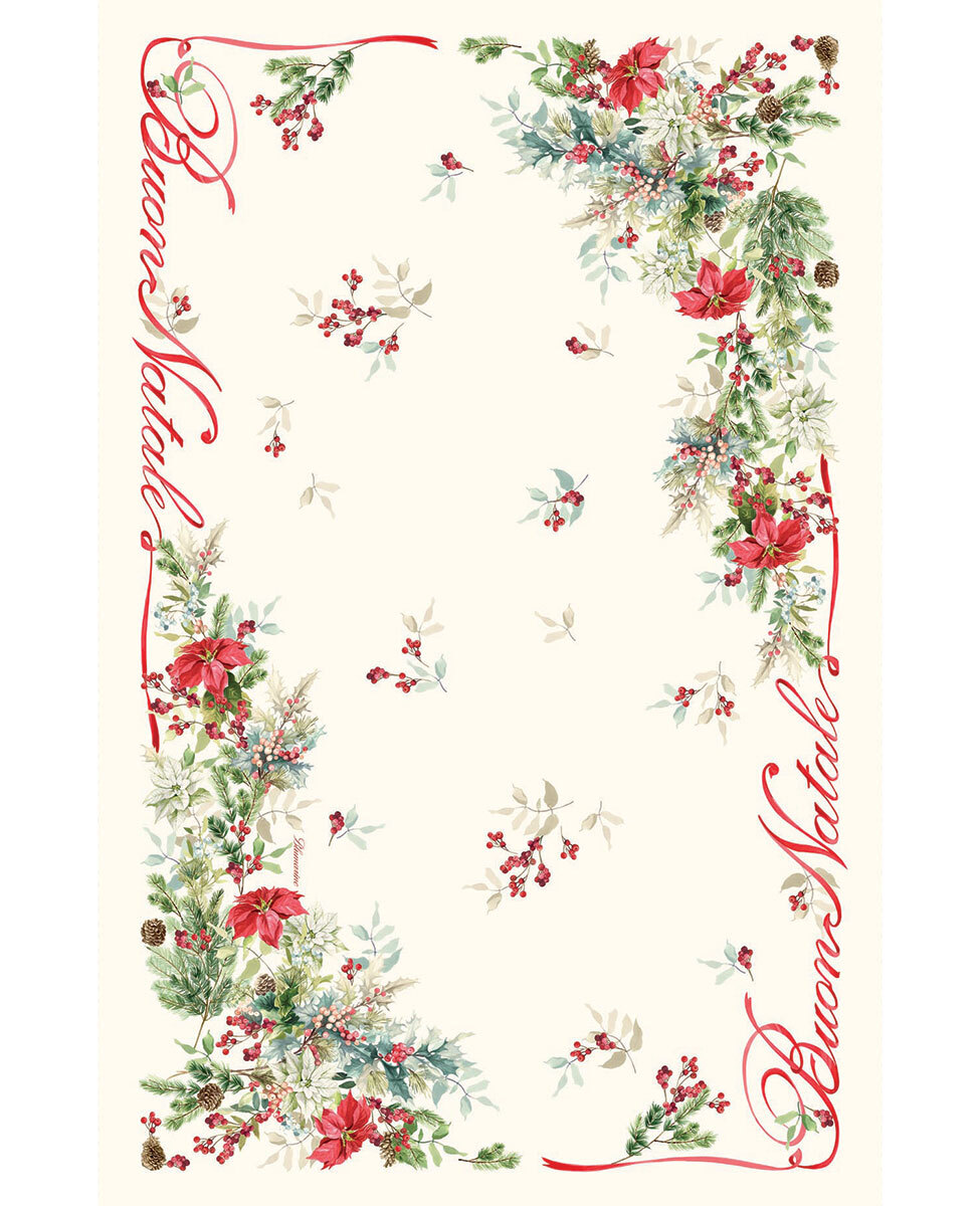 Tovaglia per 10/12 posti in panama con stampa natalizia piazzata e logo Blumarine nella trama, elegantemente confezionata in scatola, perfetta come idea regalo.