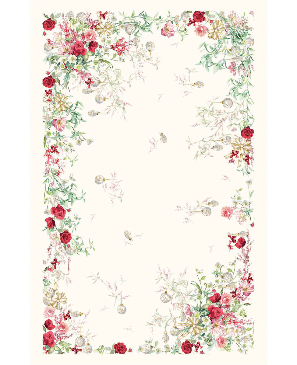 Tovaglia da 18 posti in panama con stampa natalizia piazzata e logo Blumarine nella trama, elegantemente confezionata in scatola, perfetta come idea regalo.