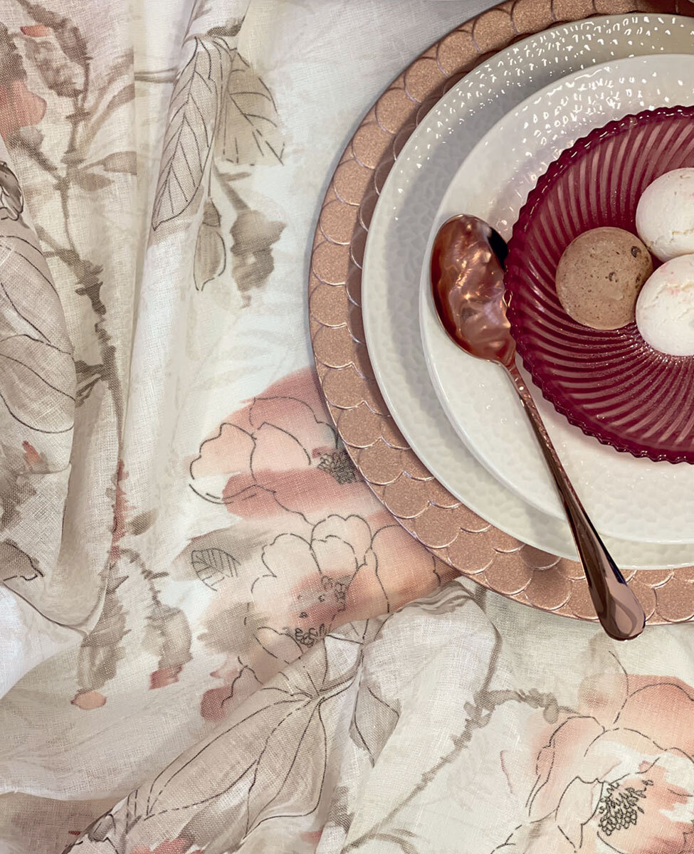 Tovaglia per 10/12 posti in misto lino stampata e rifinita con orlo a-jour e logo Blumarine nella trama, elegantemente confezionata in scatola, perfetta come idea regalo.