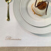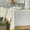 Tovaglia per 10/12 posti tinta unita bianca con bordo colorato in lino rimesso in applicazione alto 9,5 cm, logo Blumarine ricamato in tono con le fasce, elegantemente confezionata in scatola, perfetta come idea regalo.